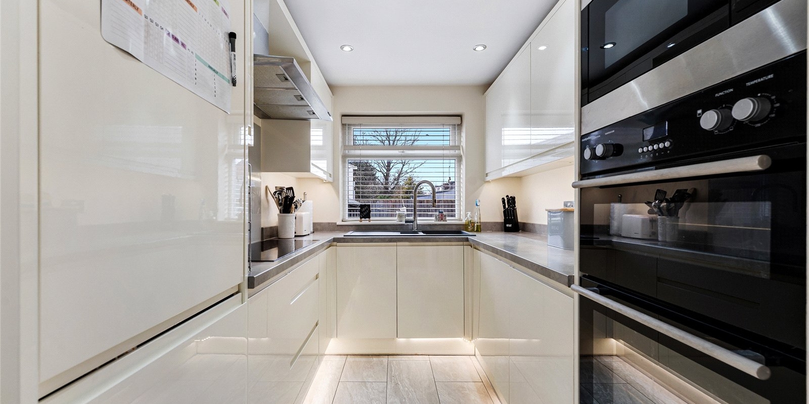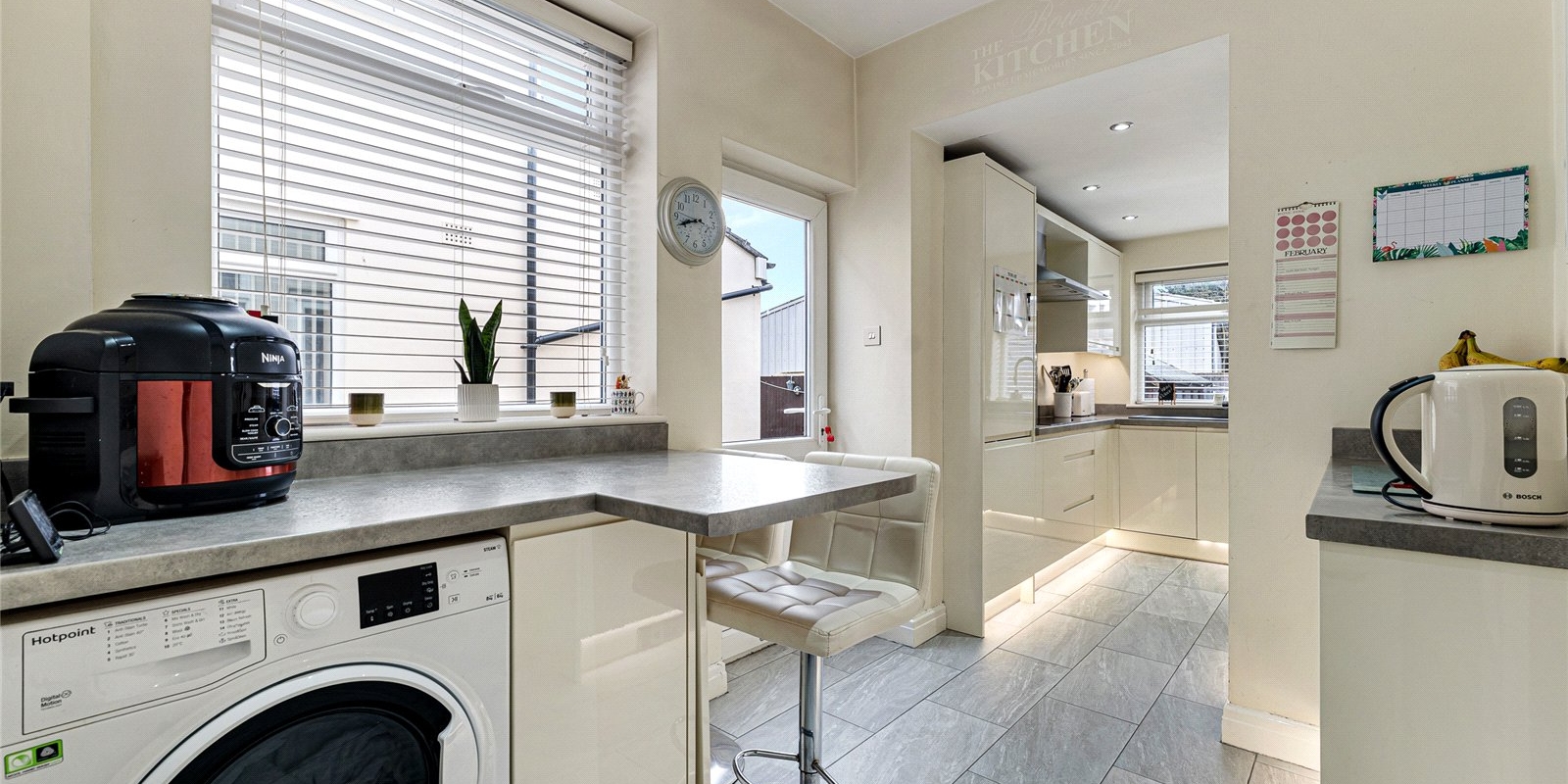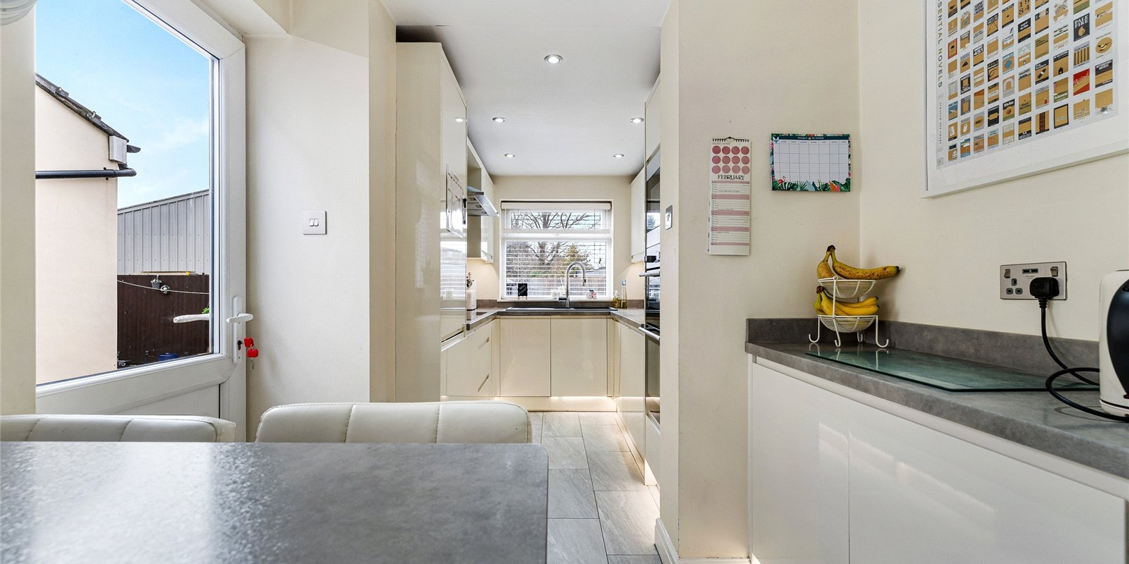 The heart of the property is its stylish, contemporary kitchen. Finished in white tones, it features integrated appliances, ensuring a clean, clutter-free look. The kitchen also boasts a convenient breakfast bar, perfect for informal dining or entertaining guests. A door leading from the kitchen provides direct access to the well-maintained garden, making outdoor dining or relaxation a breeze. Additionally, a side entrance runs along the house, offering easy access to the rear garden area.