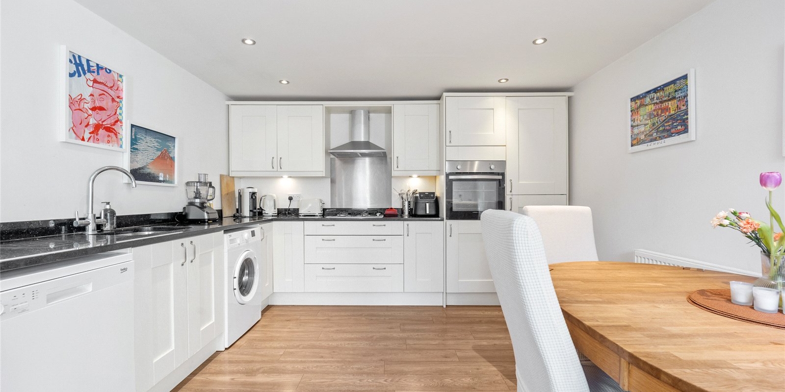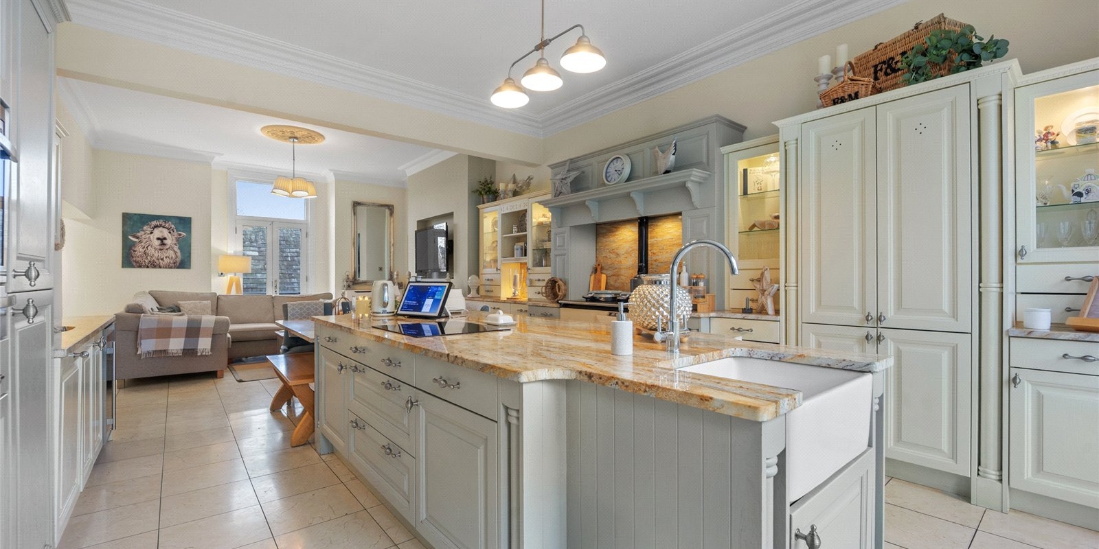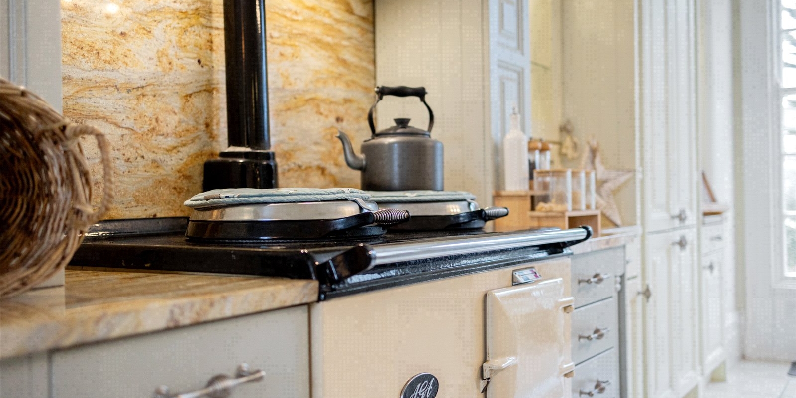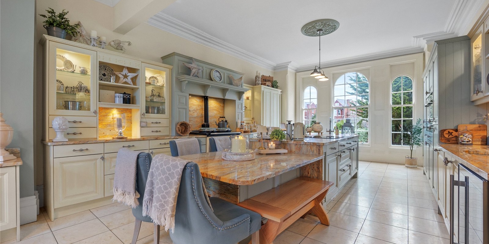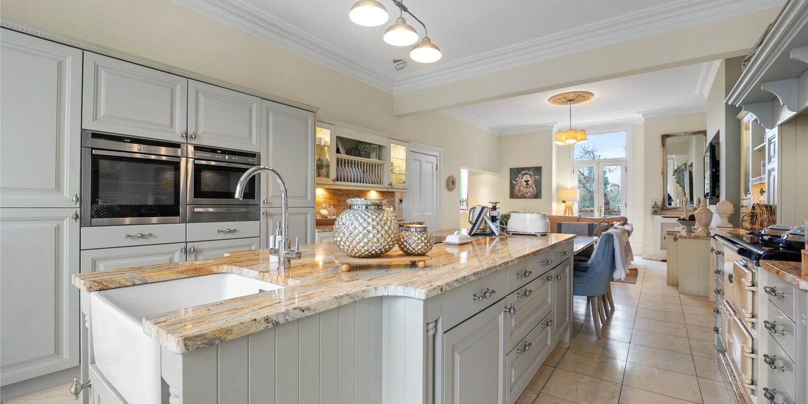At the heart of the home lies a magnificent bespoke kitchen, designed as both a practical family hub and an elegant entertaining space. The kitchen is beautifully appointed with integrated appliances and a traditional AGA, combining modern functionality with classic character. This inviting and homely space offers generous room for dining and socialising, while adjoining spaces include a separate utility room and study area, ideal for modern lifestyles and working from home.