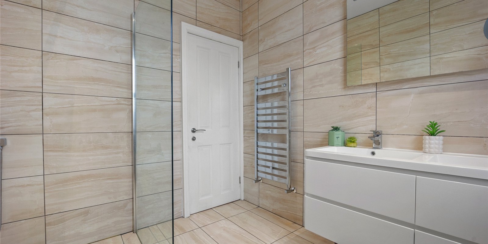 Ascending to the first floor, you will find three beautifully presented bedrooms, including a luxurious principal suite complete with a contemporary en-suite bathroom featuring a sleek walk-in shower. The family bathroom is finished in calming neutral tones and offers both a freestanding bath and in the second family bathroom is a separate shower, creating a relaxing environment.