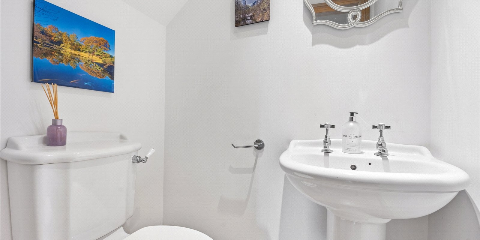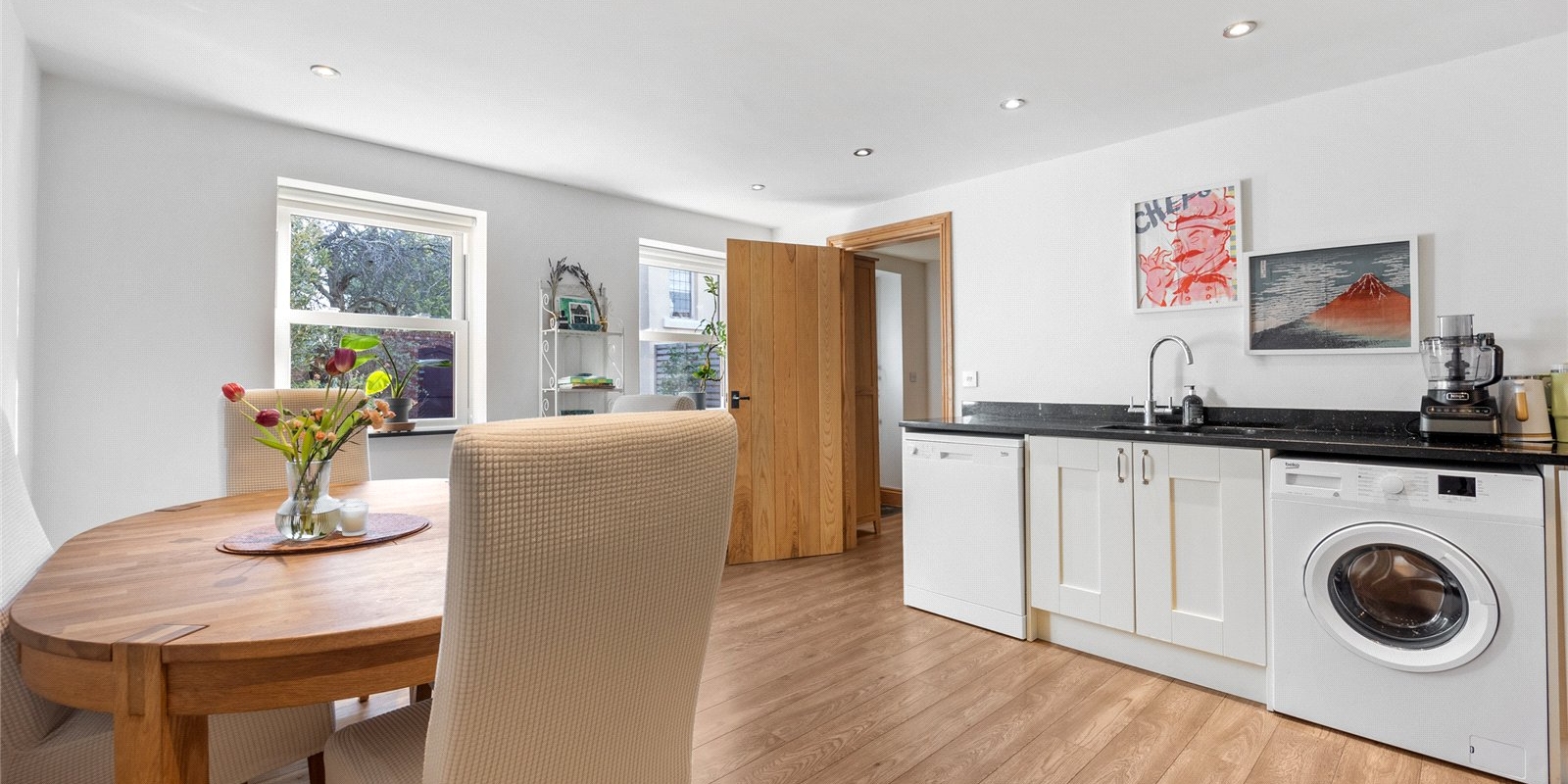 The ground floor offers a series of beautifully proportioned reception rooms, each with its own unique character. The principal reception room is particularly striking, featuring large windows, elegant wall panelling, and a charming fireplace, creating a refined yet welcoming environment for relaxing or entertaining. A formal dining room provides the perfect setting for hosting guests, while the garden room offers a tranquil retreat bathed in natural light and overlooking the garden. A stylish guest cloakroom completes the ground floor accommodation.