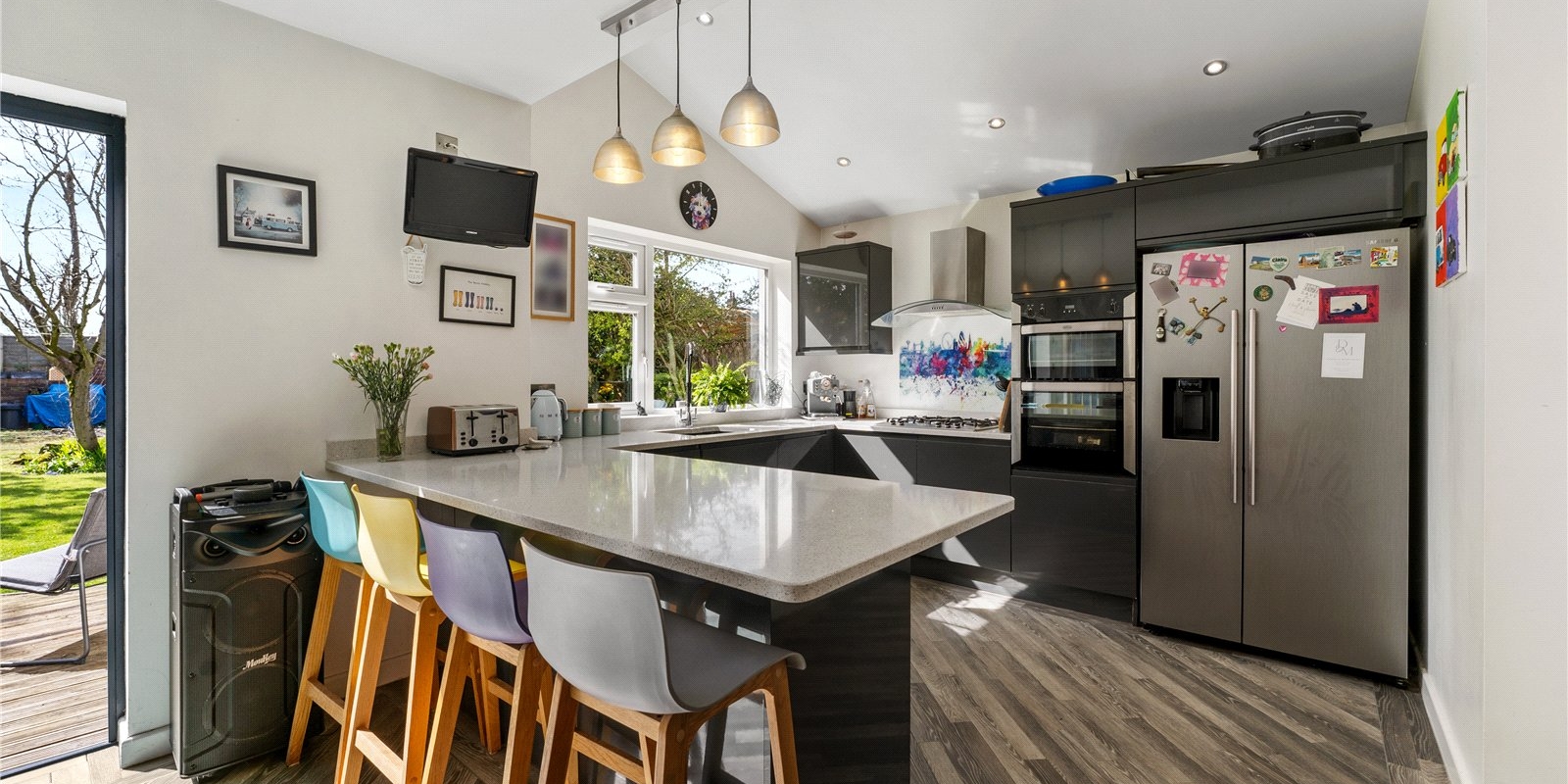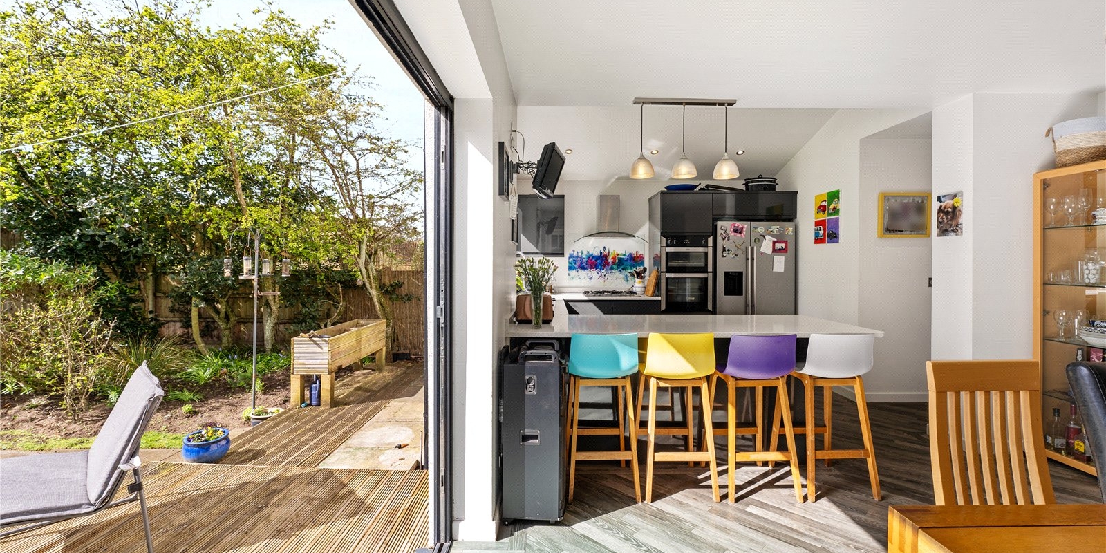 To the rear, the home truly comes into its own with a substantial second reception room, flooded with natural light and offering generous proportions for both living and entertaining. This seamlessly connects to the heart of the home—a stunning, contemporary dining kitchen. Thoughtfully designed, the kitchen boasts sleek composite work surfaces, an integrated cooker and hob, and a central island providing additional preparation and social space. There is ample room for a full-sized dining table, making it perfect for family meals and gatherings. Bifold doors open directly onto a decking area, creating a seamless transition to the outdoors.