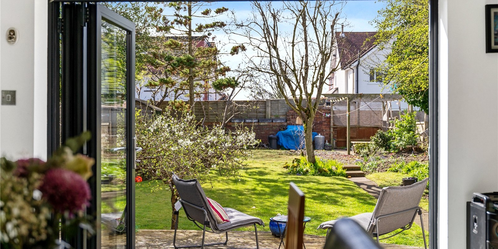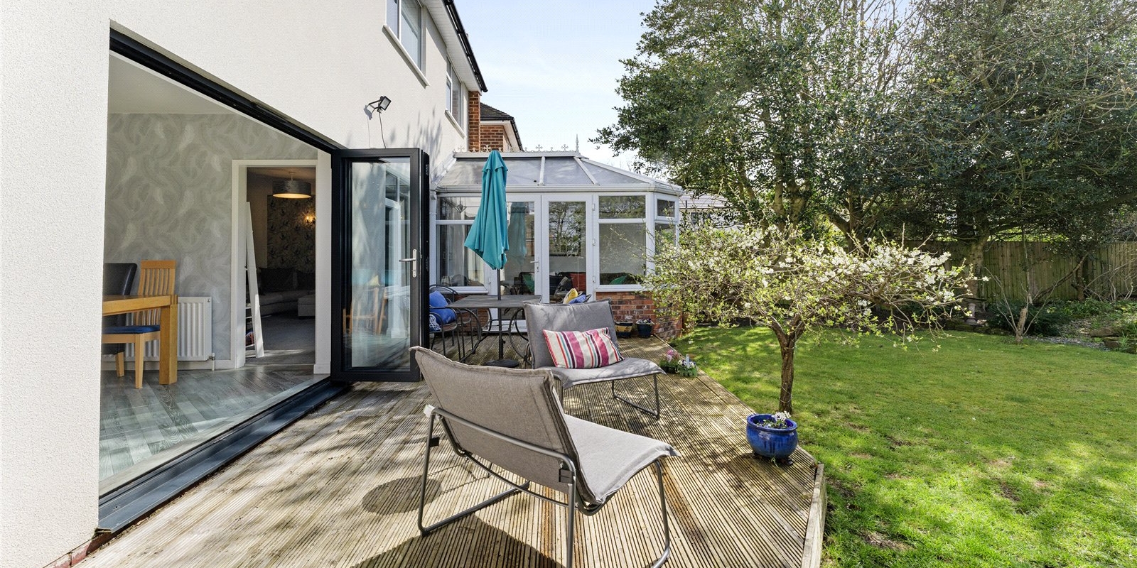 Externally, the property is equally impressive. A private driveway to the front provides convenient off-road parking. To the rear, the beautifully maintained south-facing garden is a standout feature, enjoying sunlight throughout the day and offering a high degree of privacy. Thoughtfully designed for both relaxation and entertaining, the garden includes a raised decking area ideal for outdoor dining, a pergola creating a charming shaded seating area, and well-kept lawned sections.