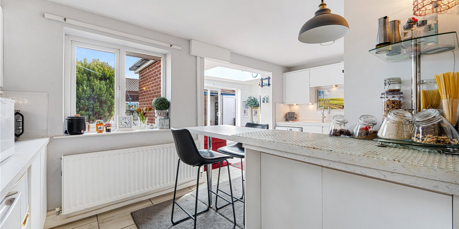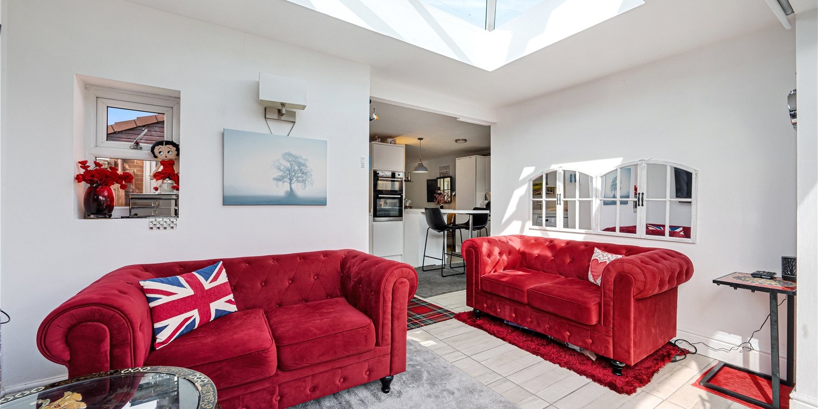 Inside, the home features a bright and airy open-plan sitting room, enhanced by a stylish roof lantern that floods the space with natural light, creating a warm and inviting atmosphere. The neutral kitchen complements the open layout, offering a clean and contemporary feel ideal for both everyday living and entertaining.