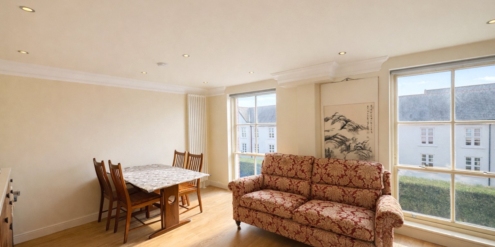 Lounge/Dining Area - 20' x 15' 6" (6.10m x 4.72m) Two double glazed sash windows, recessed ceiling with coving, spotlights, two central heating radiators, television point, telephone point, electrical points and space for dining table and chairs.