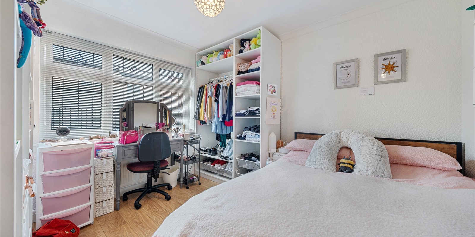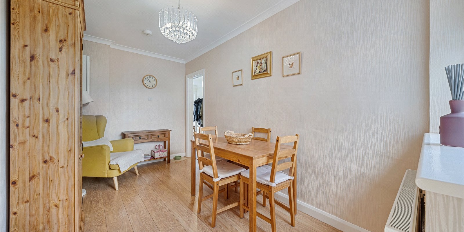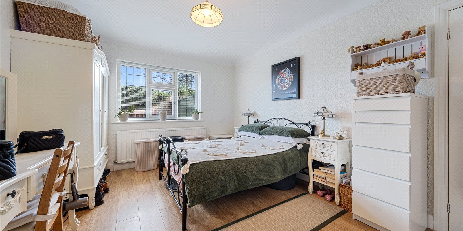 The kitchen is well-proportioned and conveniently located, with access to the rear garden. There are two generously sized bedrooms, including a large primary bedroom, along with a well-appointed bathroom.