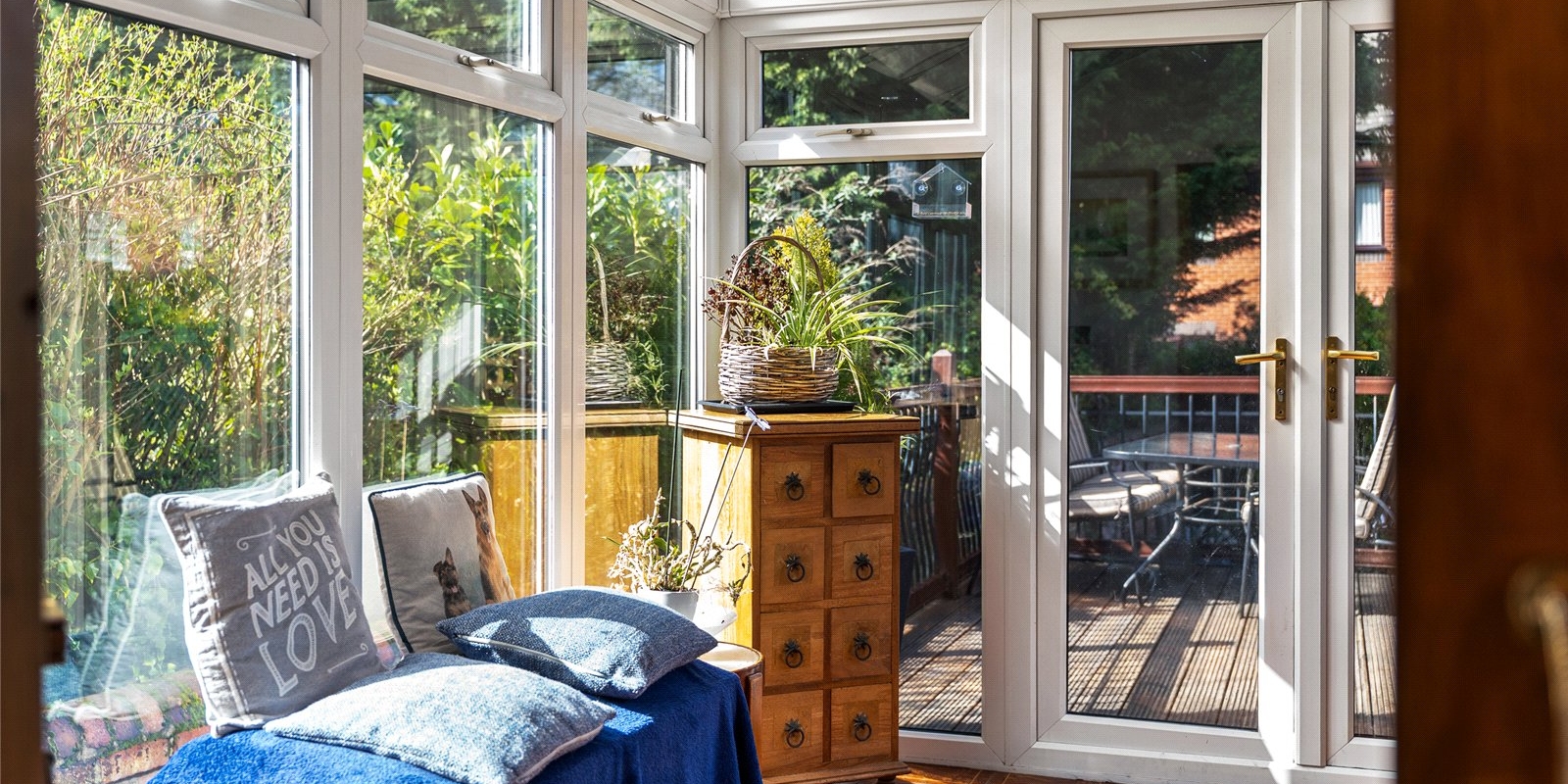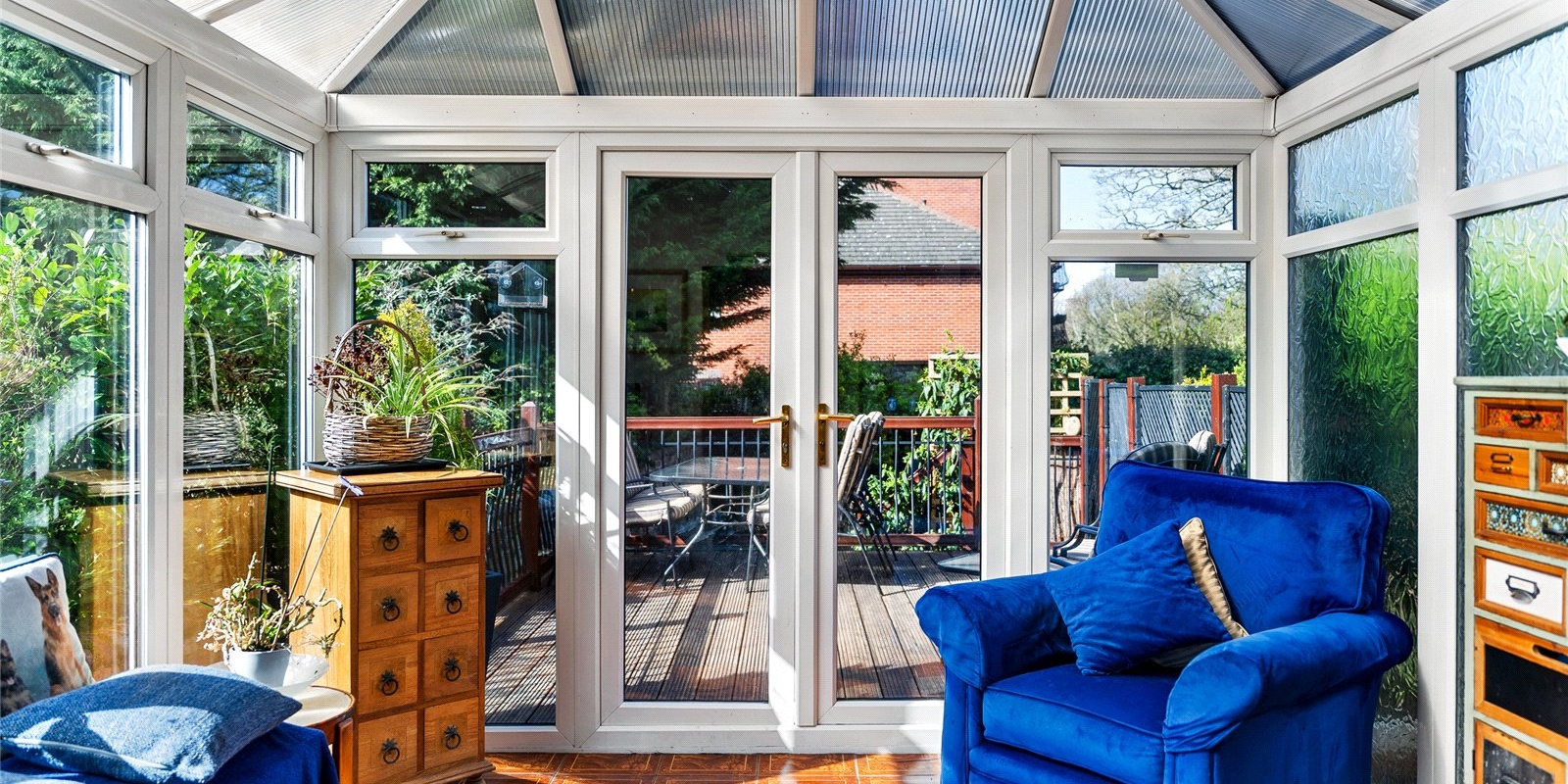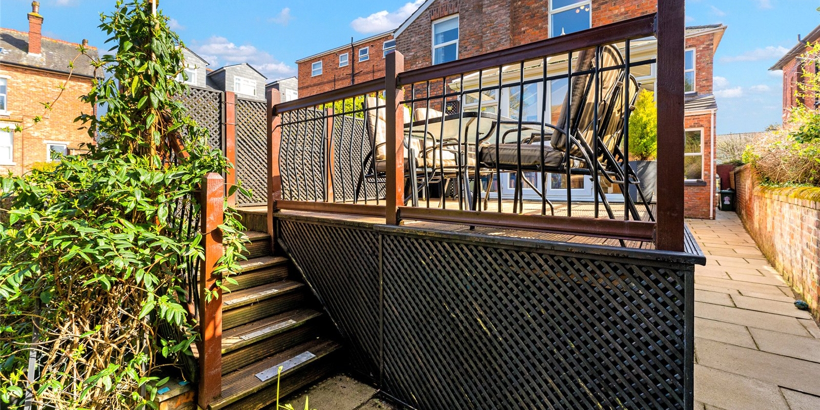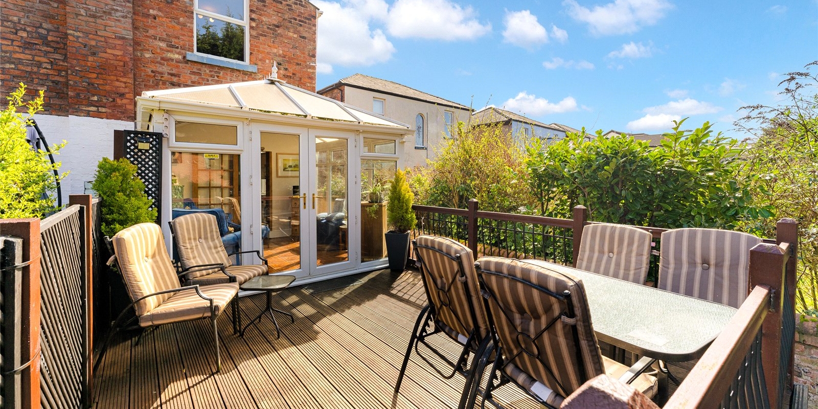To the rear, a bright and airy conservatory creates an additional reception space, enjoying a sunny aspect and pleasant views over the garden. This leads directly onto a raised terrace—perfect for outdoor dining—while steps descend to a beautifully maintained, private garden, offering a peaceful retreat with a high degree of seclusion. A useful side access adds further practicality.