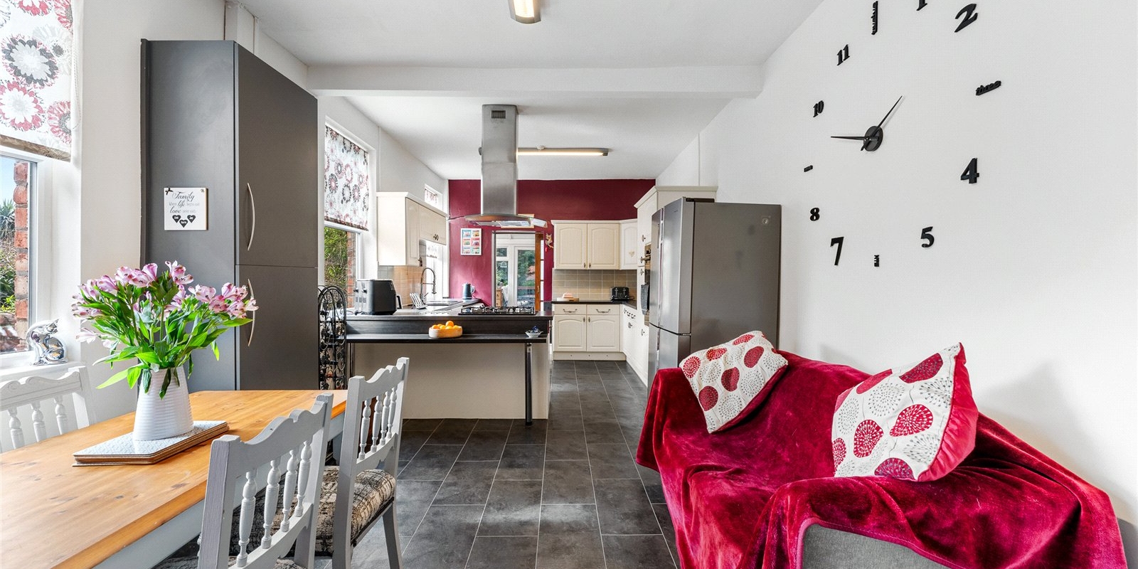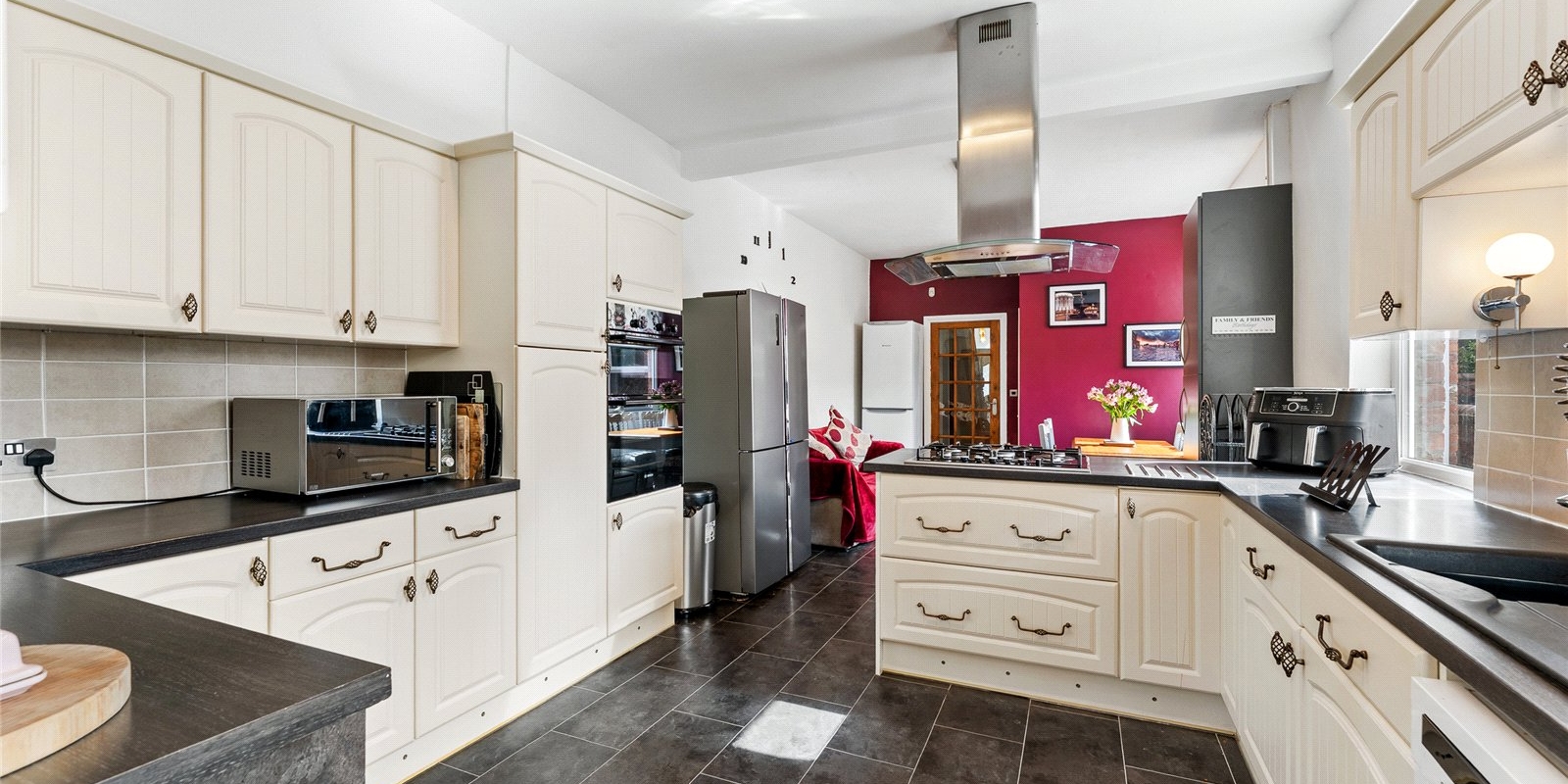 A second reception room, currently utilised as a formal dining room, provides further versatility and flows seamlessly through to the stunning open-plan kitchen. The kitchen has been finished to a high modern standard, featuring sleek fittings, ample storage and generous worktop space, perfectly suited to contemporary family living and hosting.