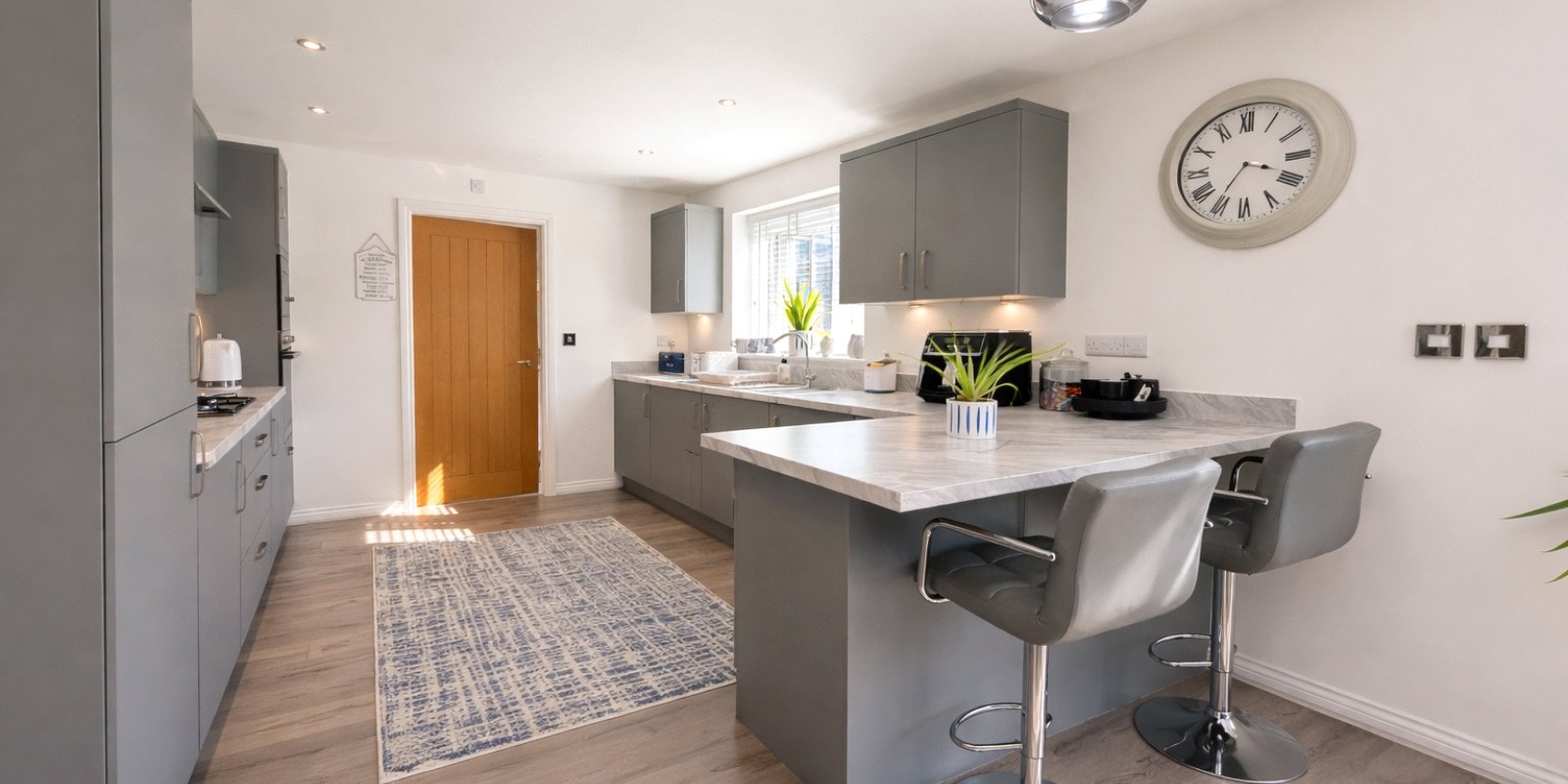 The property opens into a welcoming entrance hallway with useful storage, leading through to a spacious and well-proportioned lounge, providing a bright and comfortable living environment. To the rear, the open-plan kitchen and dining room has been thoughtfully improved with the addition of a modern kitchen island, creating a highly sociable and practical space ideal for both everyday living and entertaining.