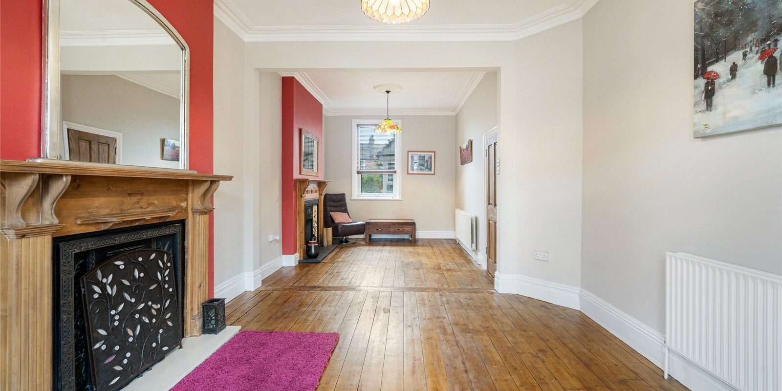 As you step inside, you're greeted by the high ceilings and beautiful stained-glass windows in the hallway, setting the tone for the rest of the property. The two reception rooms have been cleverly combined into one large, open-plan area, creating a bright and airy space, ideal for entertaining or relaxing with the family. The room is enhanced by elegant fireplaces, adding warmth and character to the space.