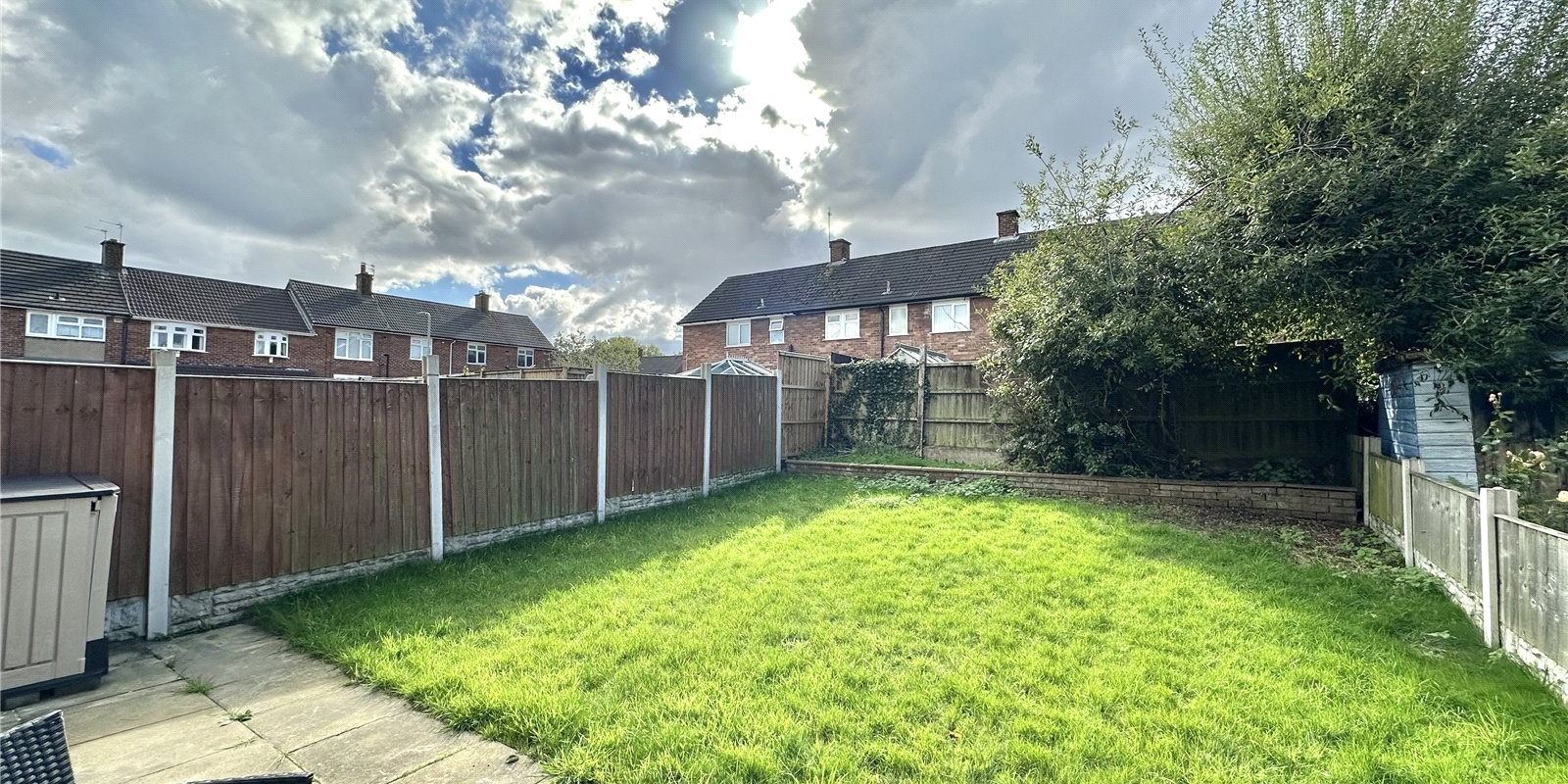 Outside, the property continues to impress with a generous rear garden featuring a well-maintained lawn and a paved patio area—perfect for outdoor dining or simply enjoying the sunshine.
