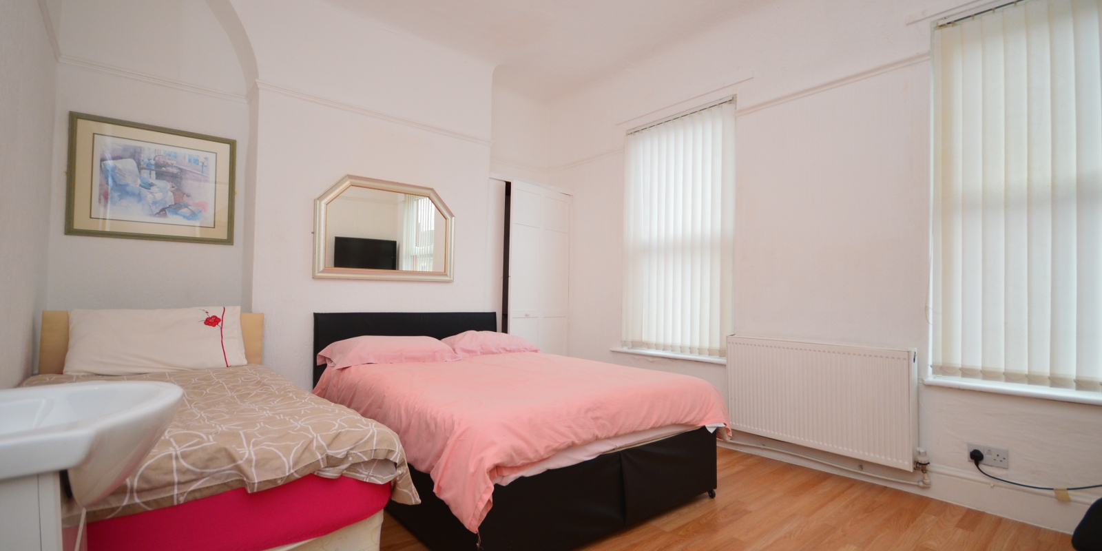 Bedroom One - (4.32m x 3.4m) - Two double glazed windows to the front elevation, wash hand basin, laminate flooring and radiator.