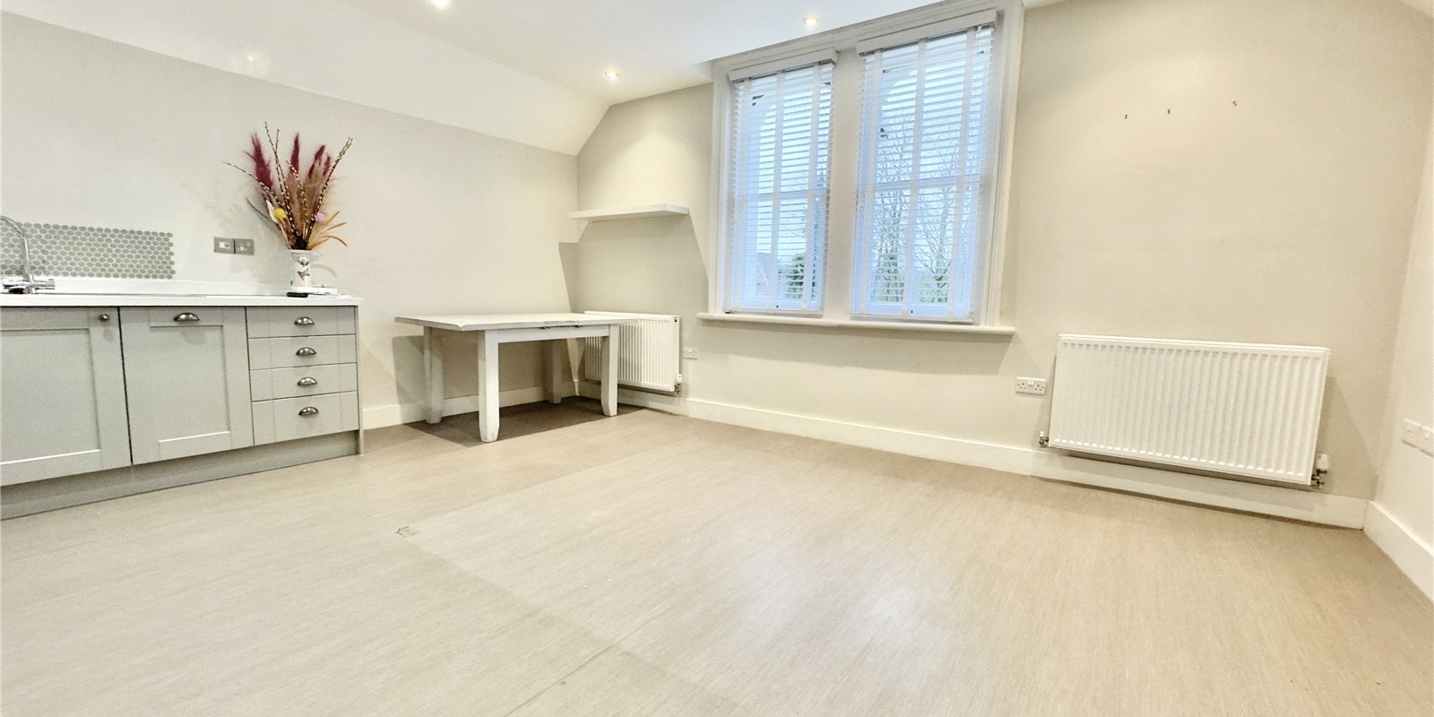Both bedrooms are well proportioned, with the principal bedroom offering a particularly spacious footprint. The second bedroom is equally versatile and can function as a guest room, home office or nursery, depending on the buyer’s needs. A modern bathroom sits off the hallway, finished in a clean, neutral style that will appeal to a wide range of tastes.