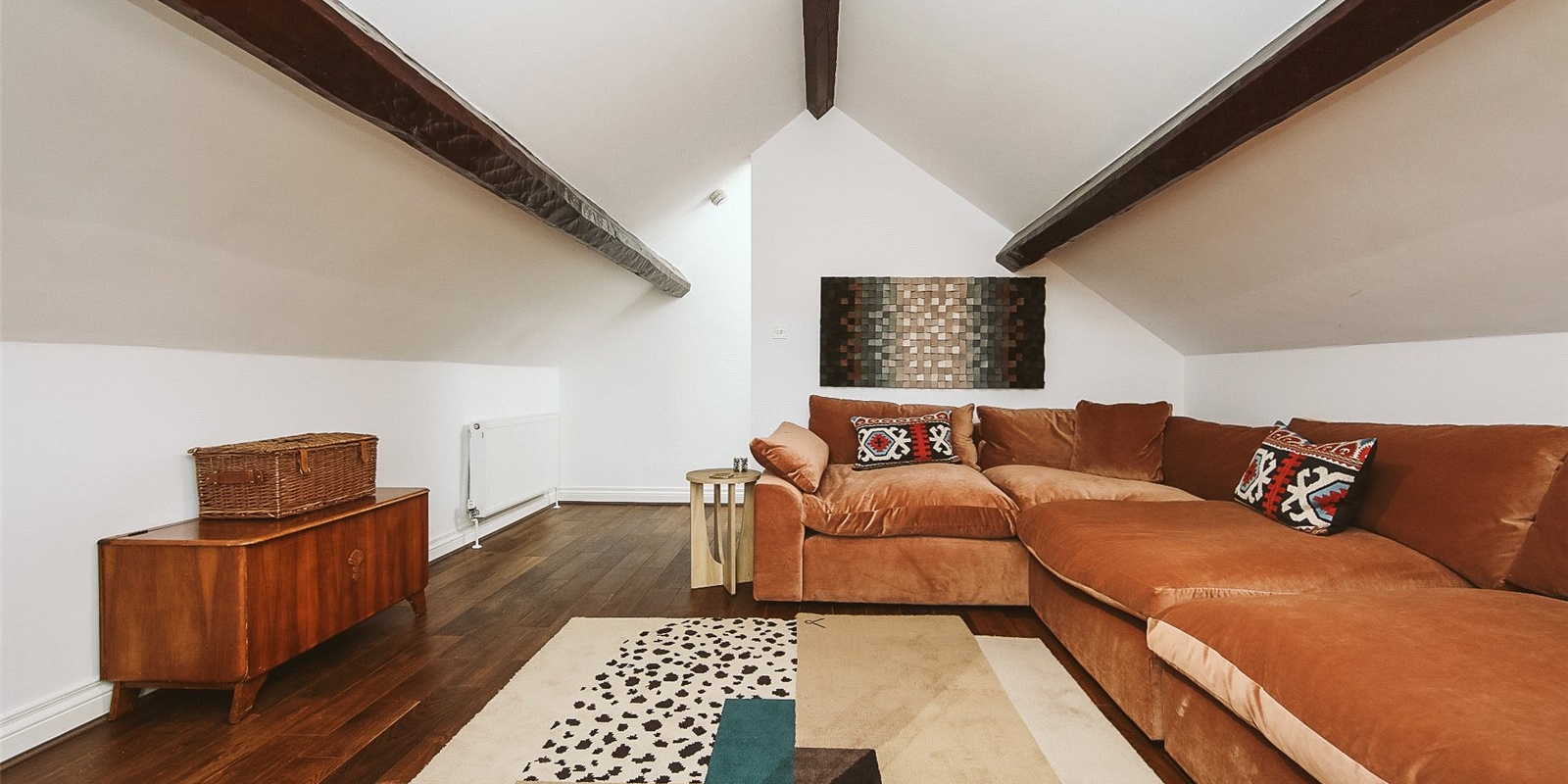 The upper level boasts a uniquely versatile second bedroom featuring beautiful original beams, vaulted ceilings, and stylish wooden flooring. Currently used as an additional lounge area, this room can serve equally well as a guest room, home office, or bedroom—tailored to suit your lifestyle.