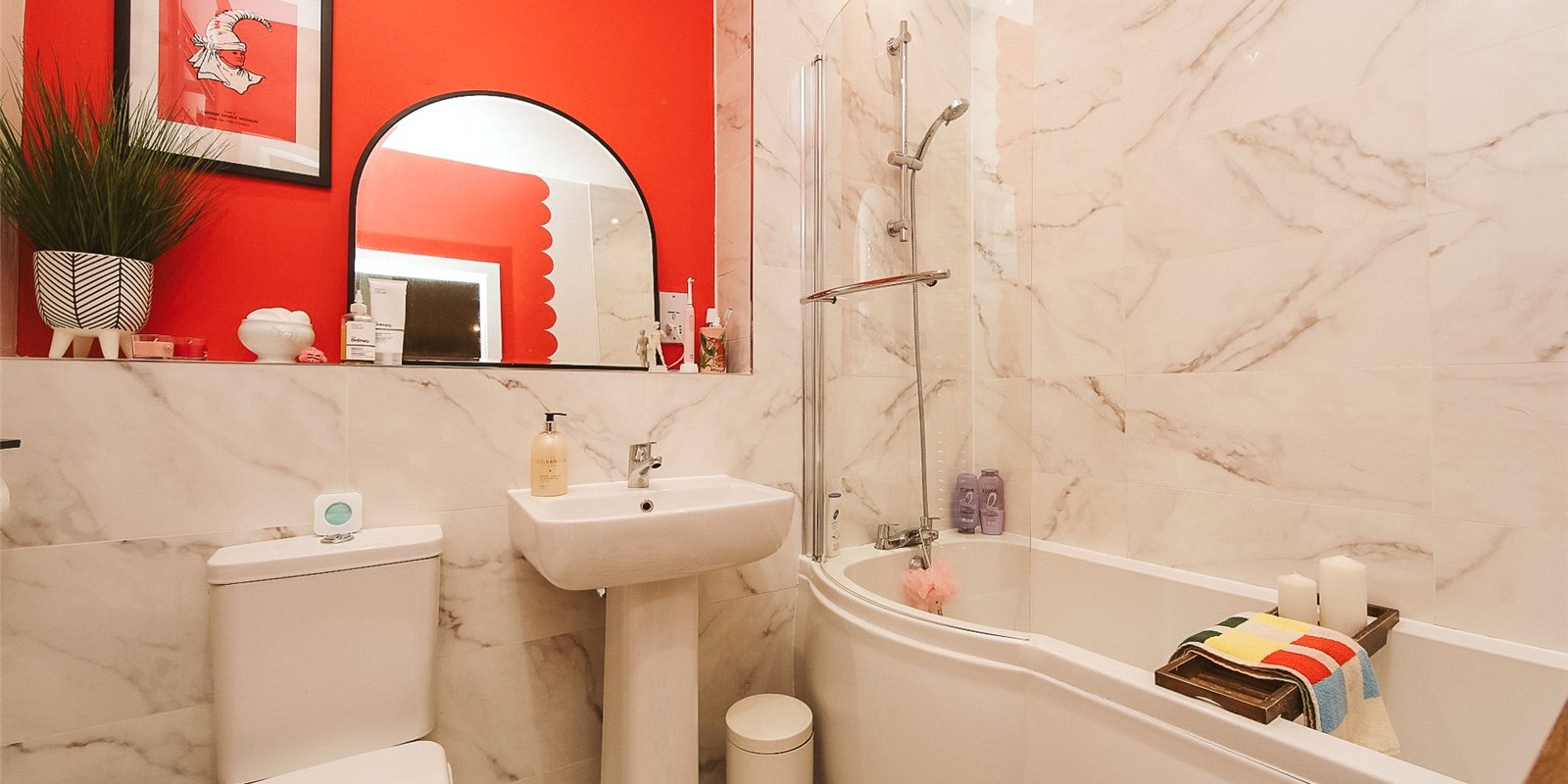 Modern three-piece bathroom suite, complete with bathtub and overhead shower