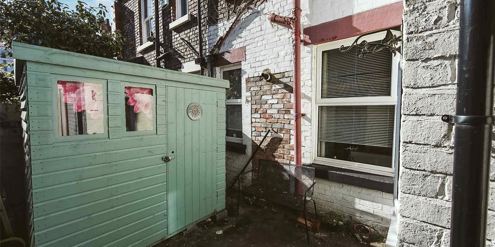 Private rear yard with storage shed.