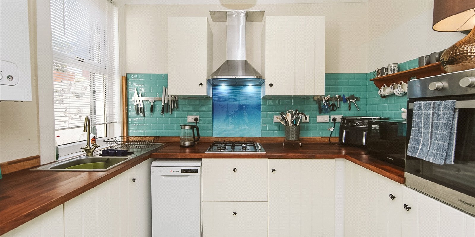 The modern kitchen features ample worktop and cupboard space, integrated appliances, and underfloor heating. A connecting door from the dining room leads to a small utility area.