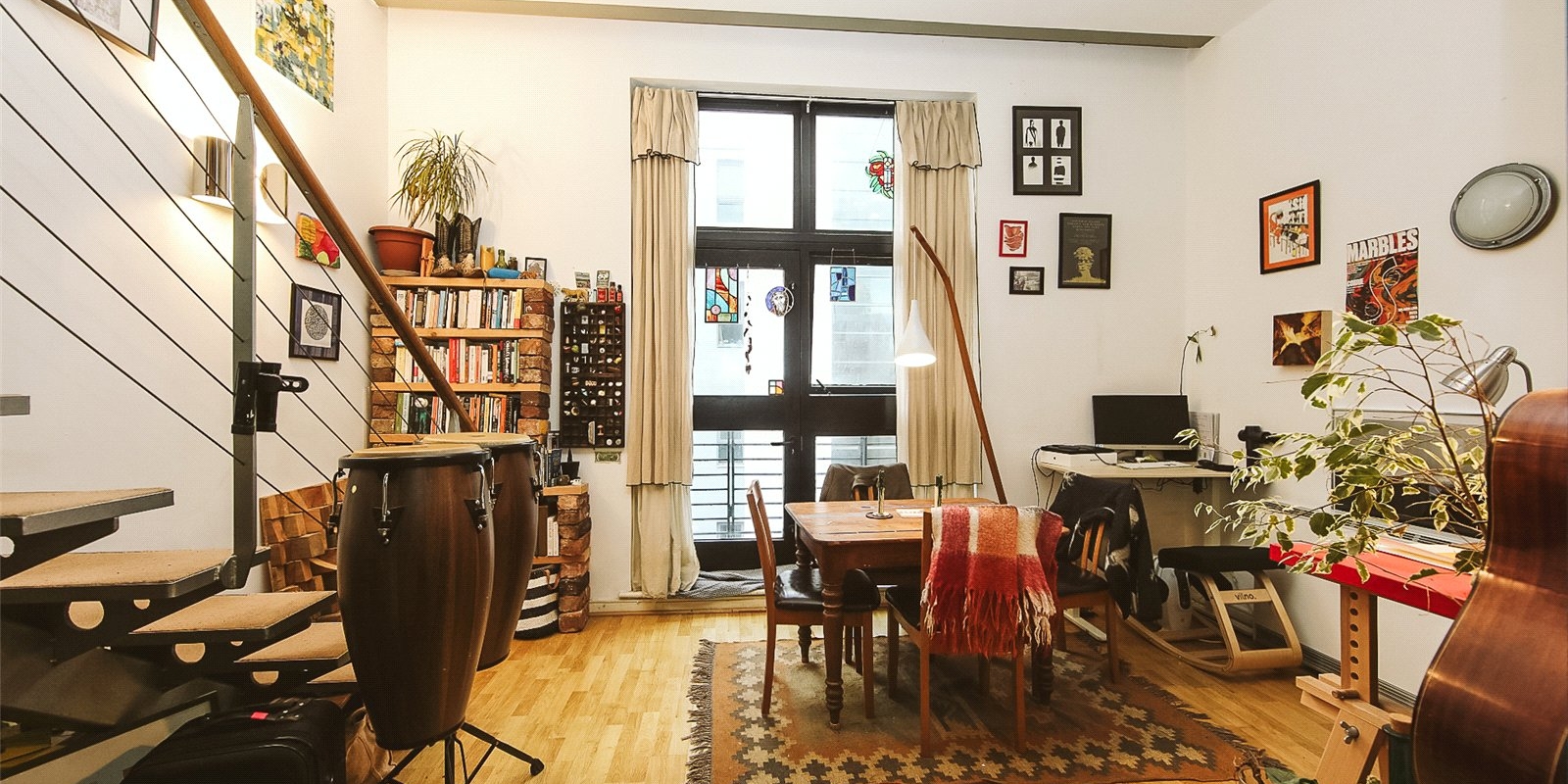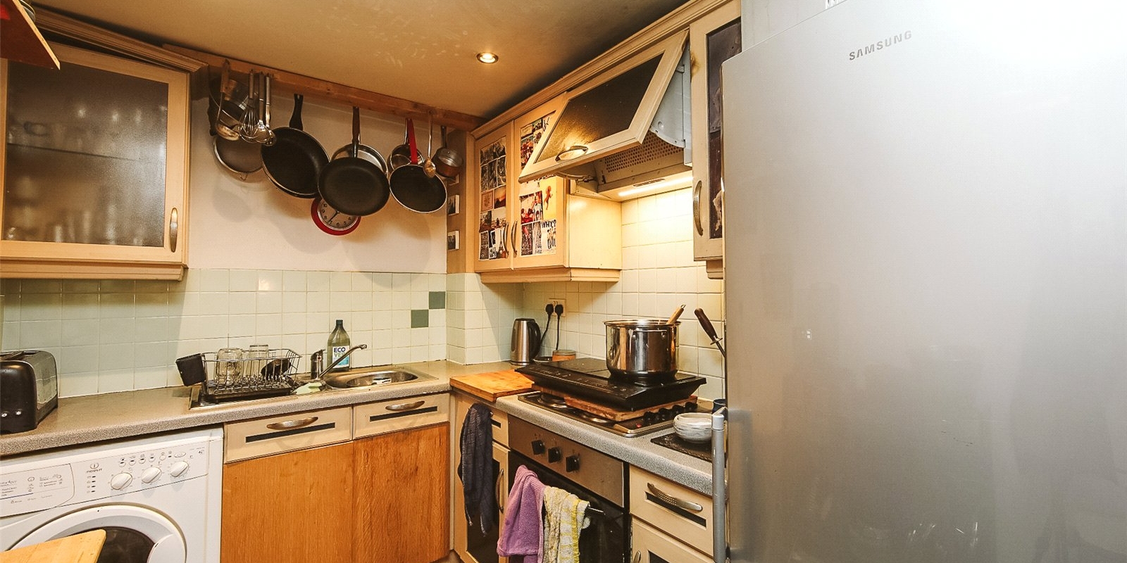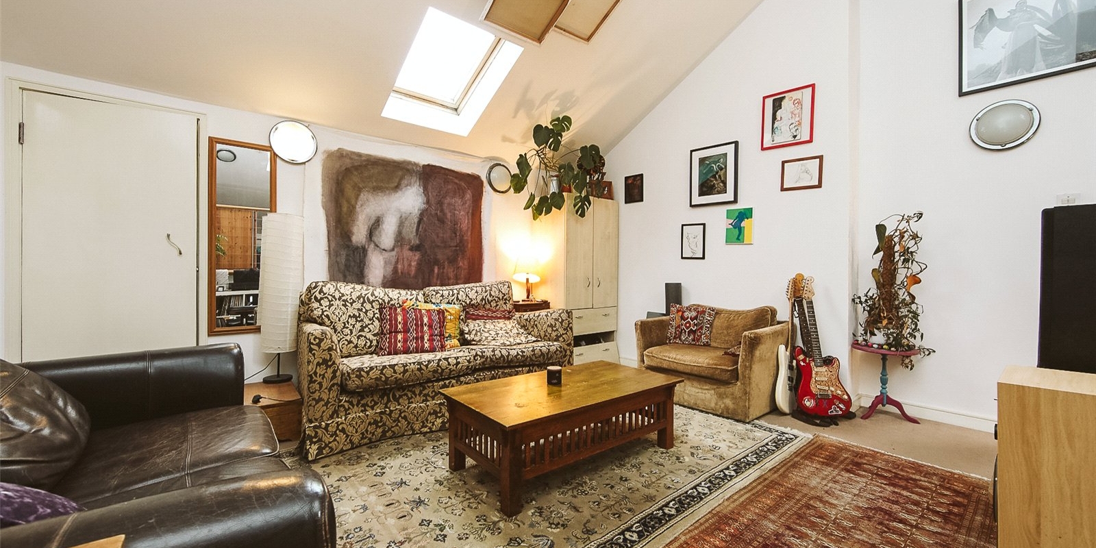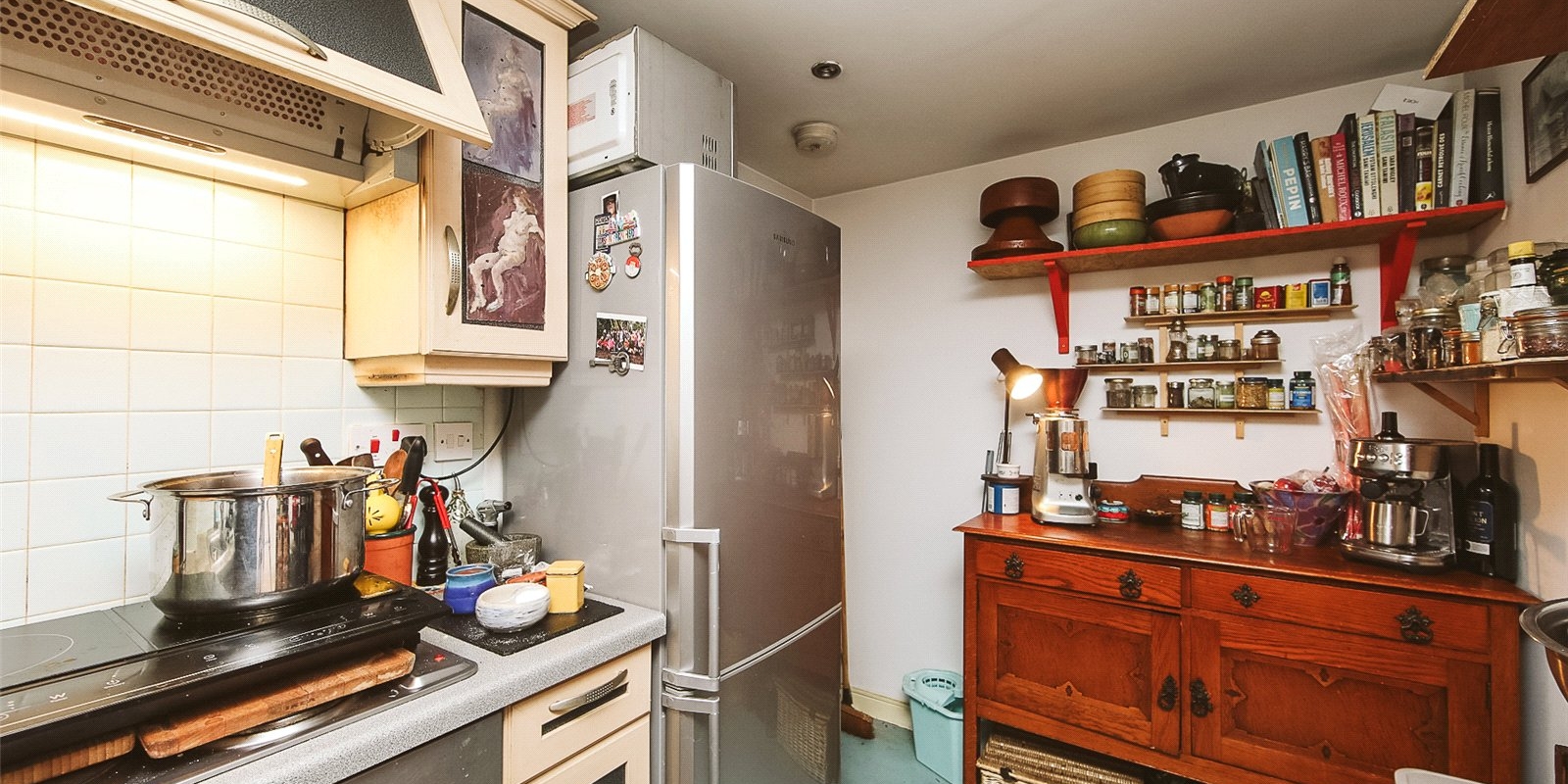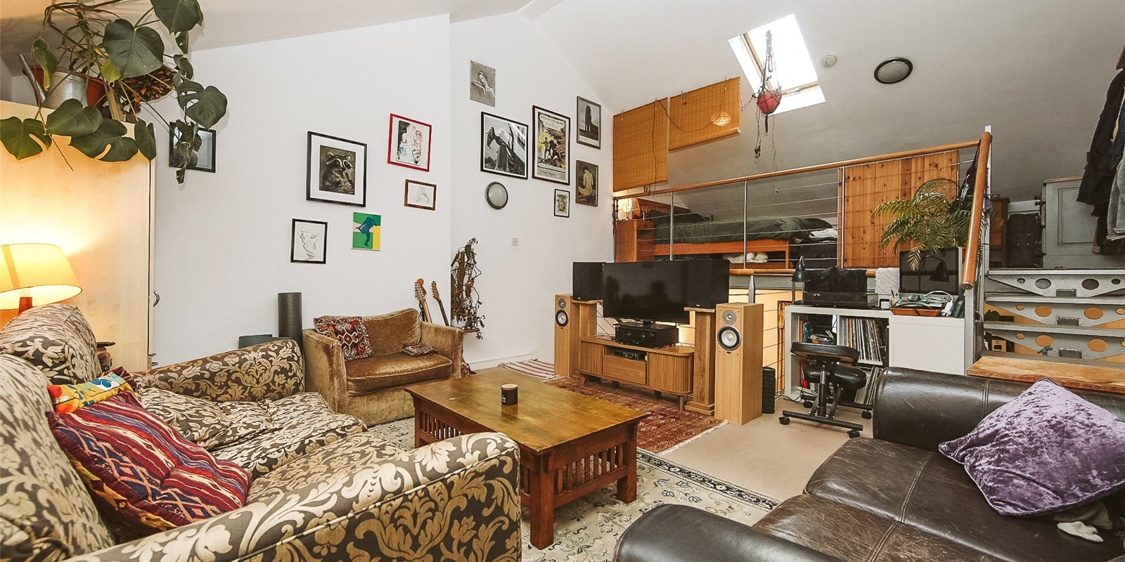 The second bedroom is a mezzanine set within the top of the block, looking over a large multi-functional reception room. The kitchen has plenty of storage and space for food preparation. The primary living room opens out onto a balcony space, perfect for enjoying a coffee in the mornings.
