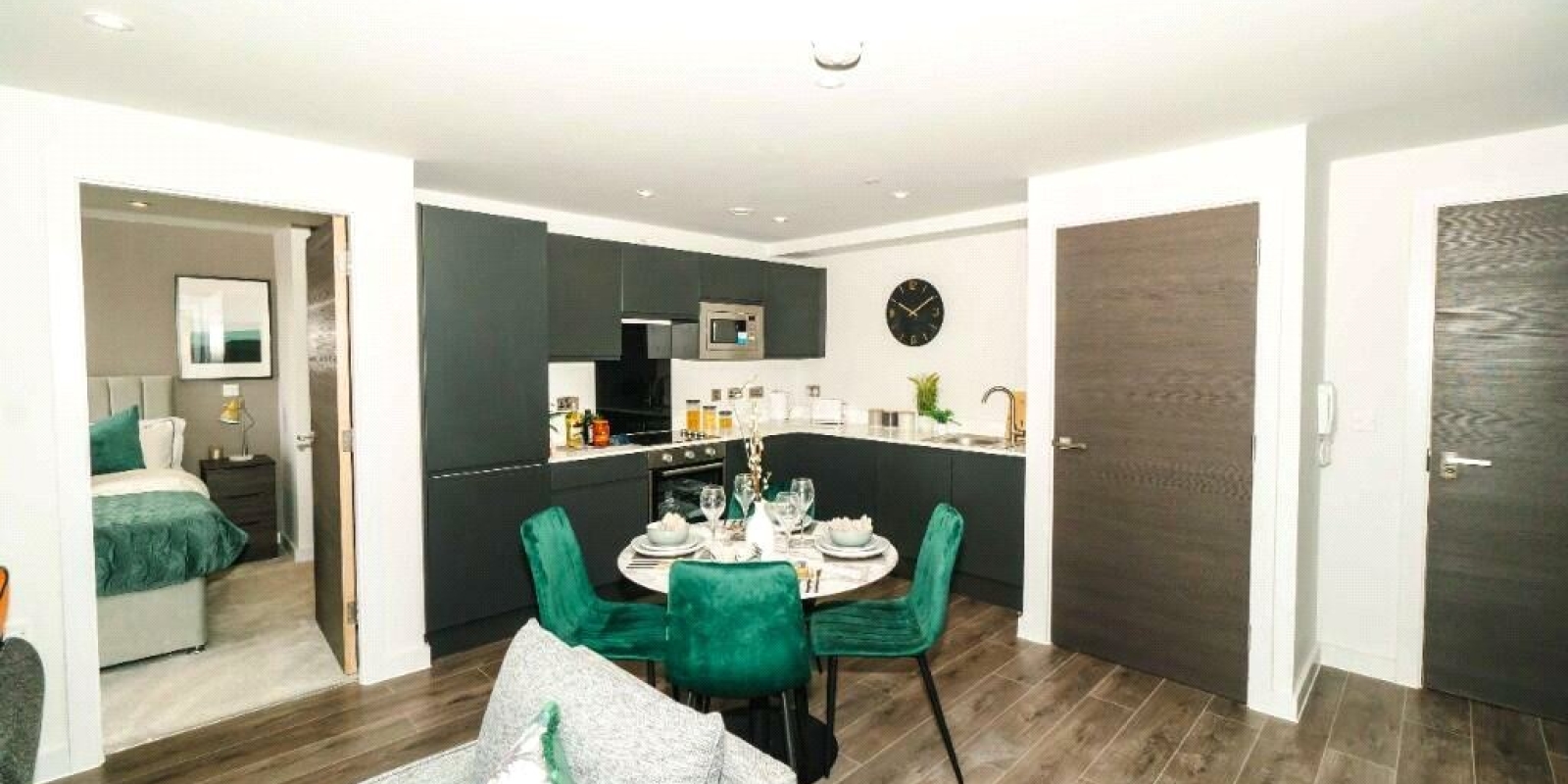 The property is thoughtfully laid out to maximise natural light and functionality. The open-plan living, kitchen, and dining area spans the full width of the apartment, creating a bright and versatile space ideal for both relaxing and entertaining. Large windows enhance the sense of openness, while the kitchen is neatly integrated with modern cabinetry and appliances, offering a clean and practical finish.