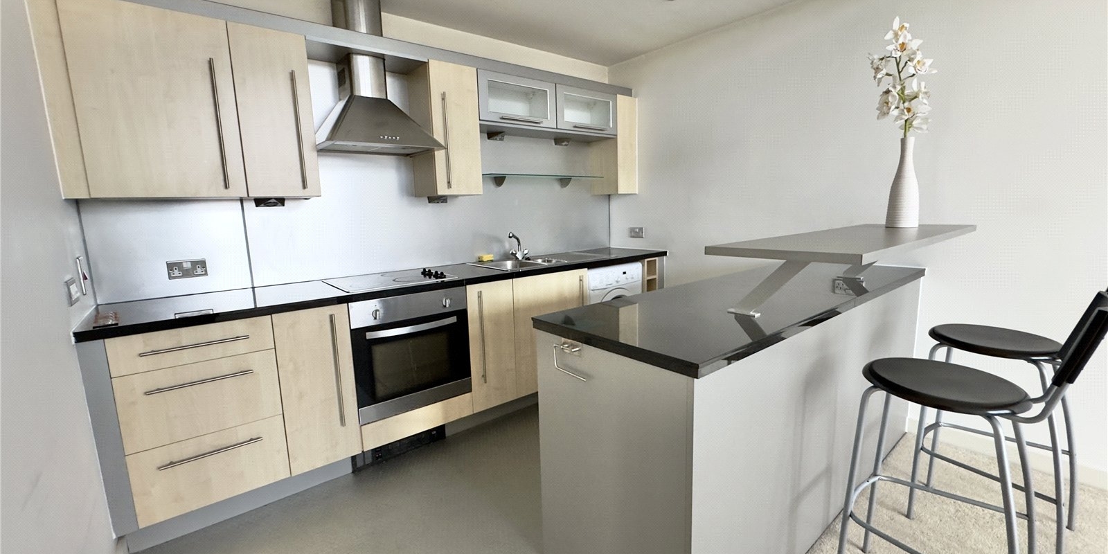The apartment features a bright and inviting open-plan living, kitchen and dining area, designed to maximise both space and natural light. The contemporary kitchen is finished with sleek units and integrated appliances, creating a clean and practical environment for everyday cooking and entertaining. The living space also provides access to a private balcony, offering an ideal spot for fresh air and outdoor relaxation.