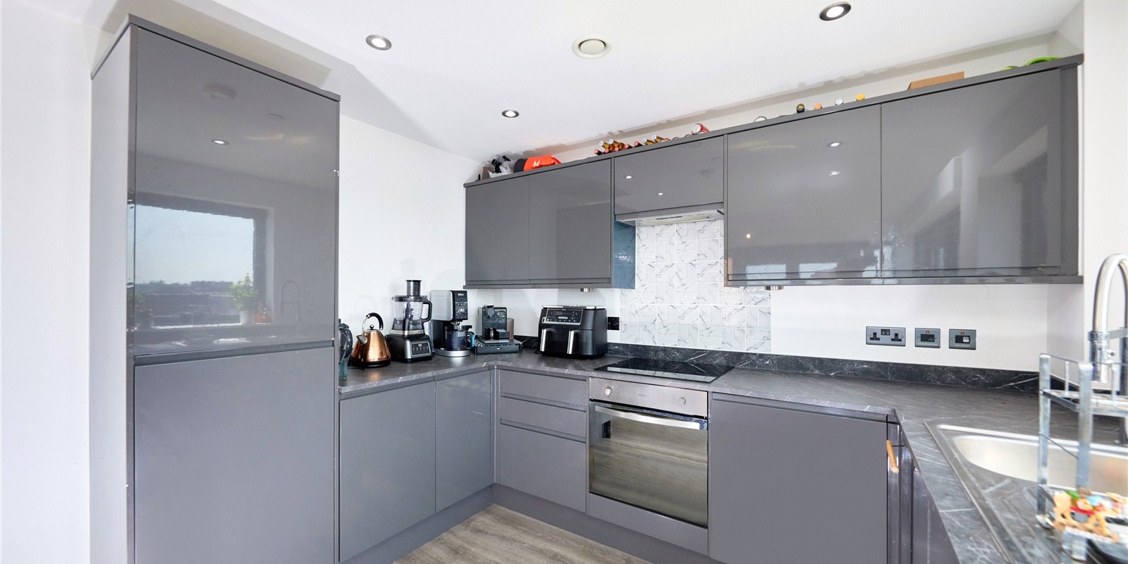 The sleek kitchen blends effortlessly into the living space, complete with high-spec, integrated appliances, modern cabinetry, and stone worktops. Whether you're cooking midweek meals or hosting a dinner party, this space is as practical as it is beautiful.