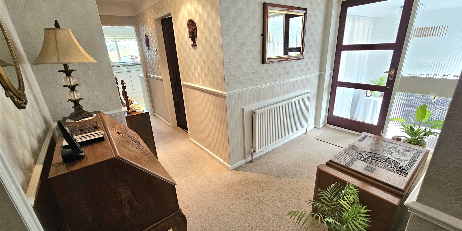 Approaching the property you will acknowledge the bungalows excellent position. There is off road parking for multiple vehicles that lead onto the garage. At 18ft long and with a WC, it’s certainly a useful space.