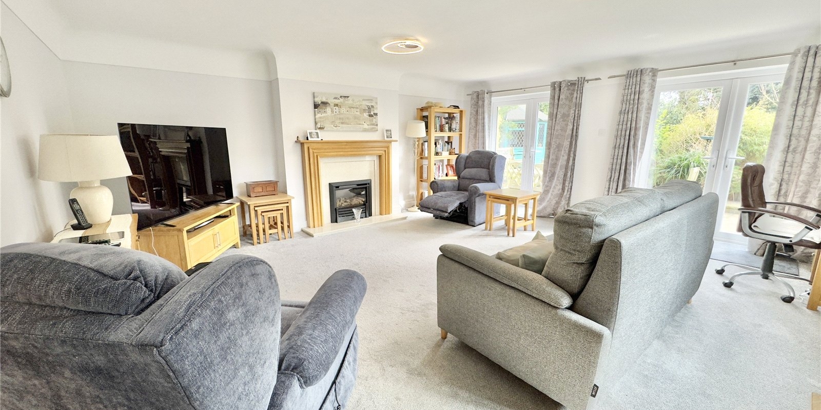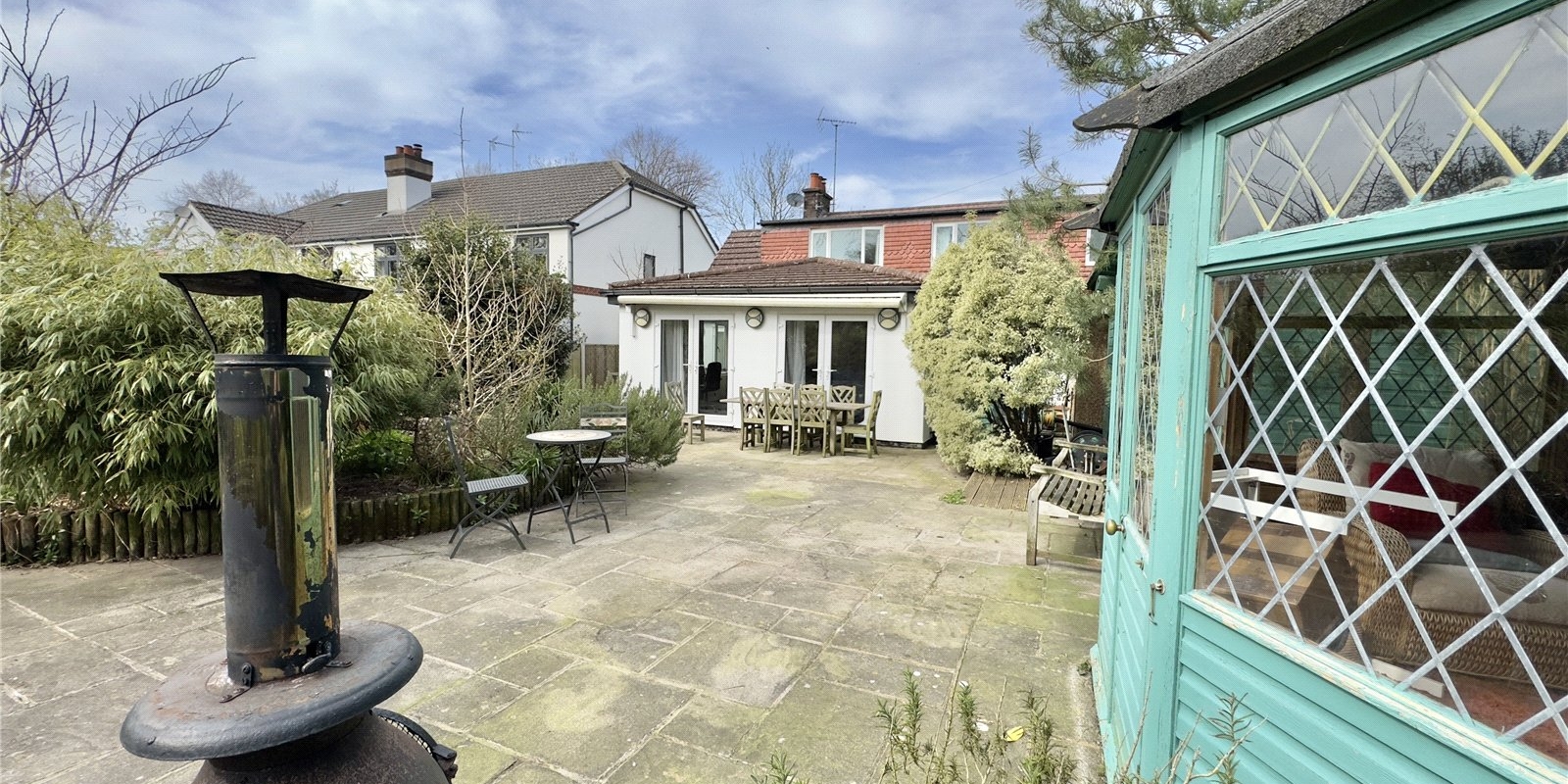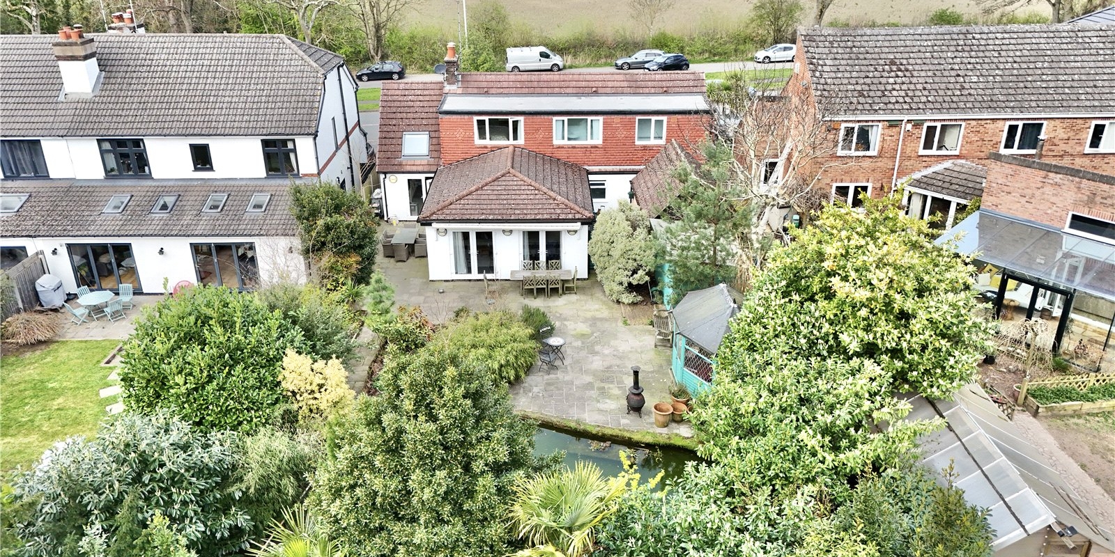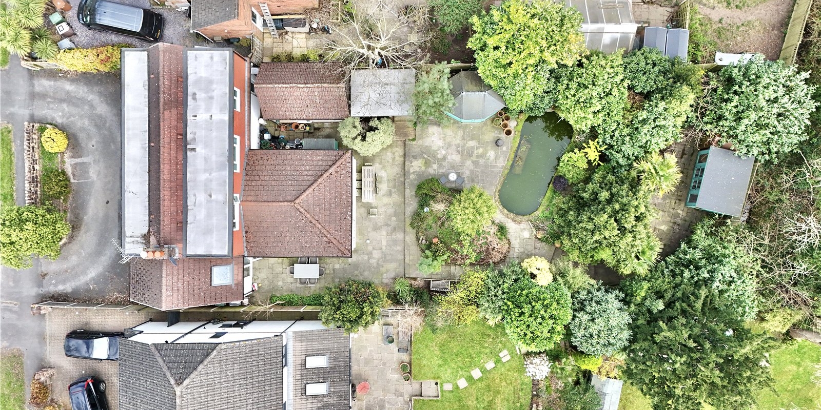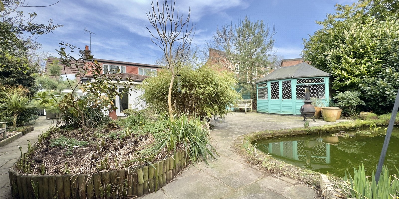 At the rear of the property, you’ll find a beautifully maintained flagged patio garden with a feature pond, and a hidden paved patio garden offering a private retreat. The former garage has been cleverly converted into office space, and there’s also a large summer house and storage shed, providing excellent versatility and storage.