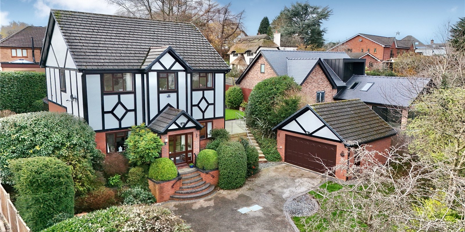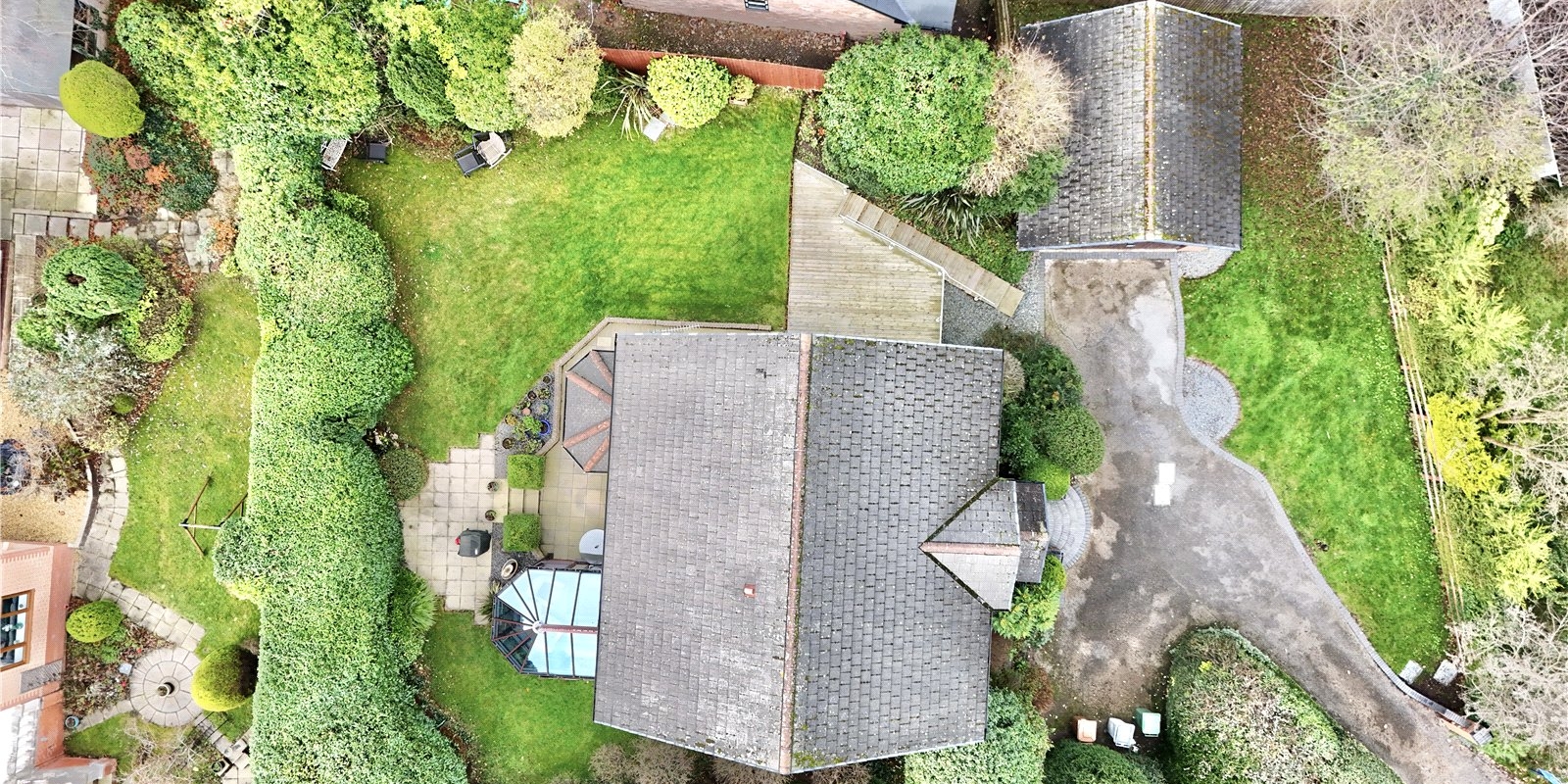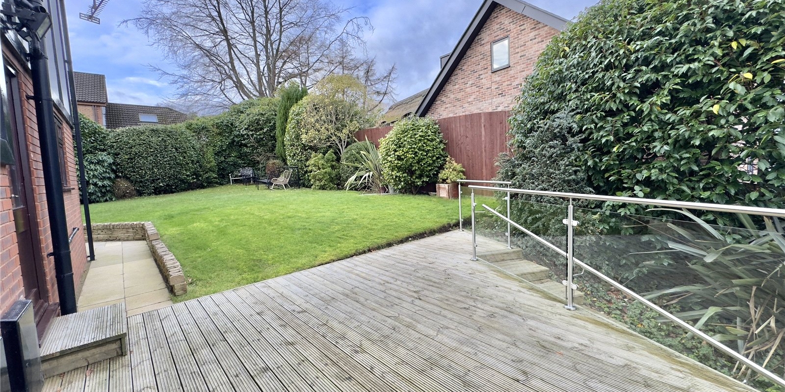 The property enjoys wrap-around gardens, including a sweeping south-facing lawn, a raised decked area with glass balustrade, and a paved patio, all beautifully framed by mature planting. There is ample off-road parking for multiple vehicles and a detached double garage.