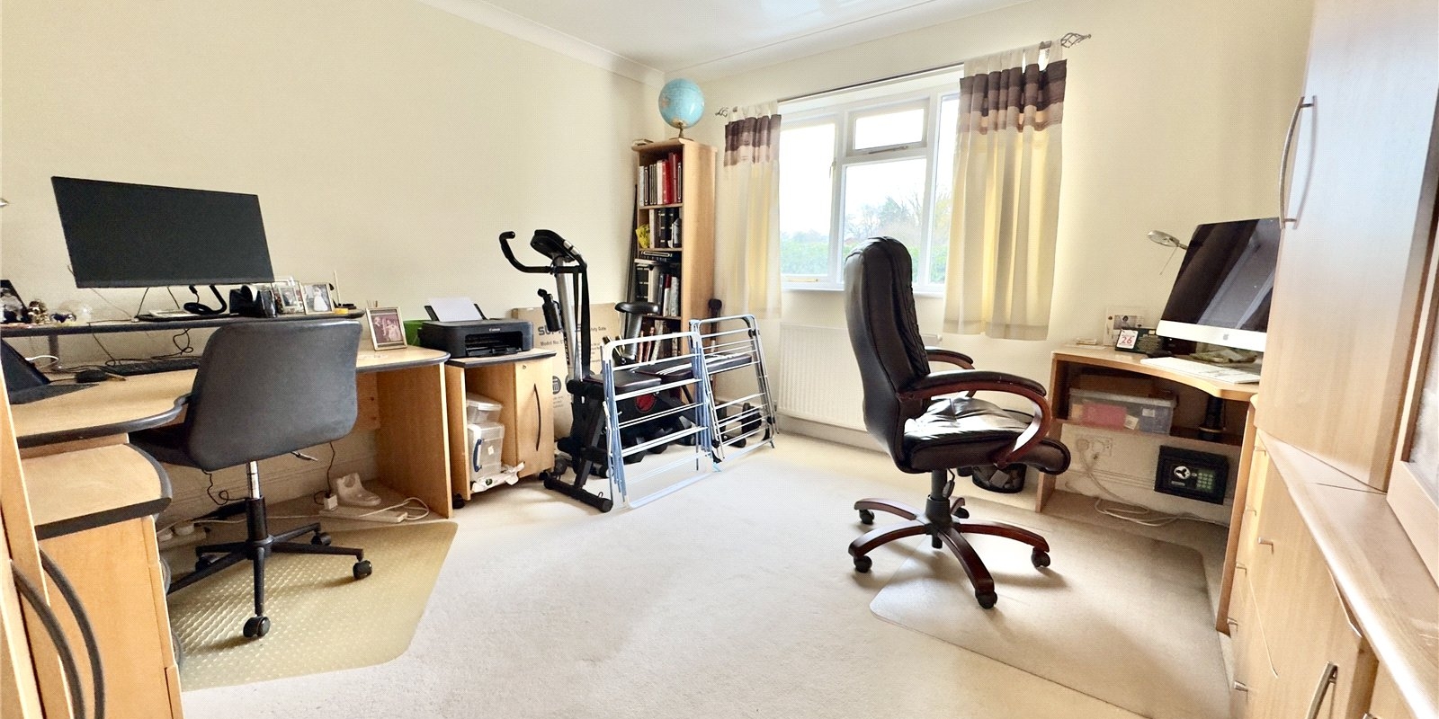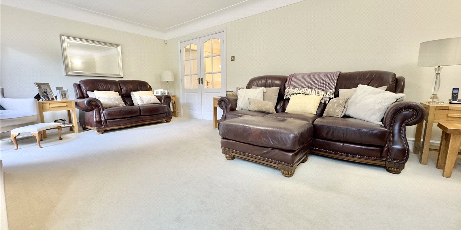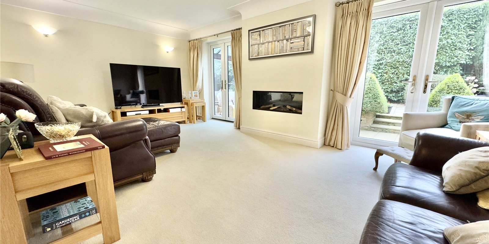 The property enjoys wrap-around gardens, including a sweeping south-facing lawn, a raised decked area with glass balustrade, and a paved patio, all beautifully framed by mature planting. There is ample off-road parking for multiple vehicles and a detached double garage.