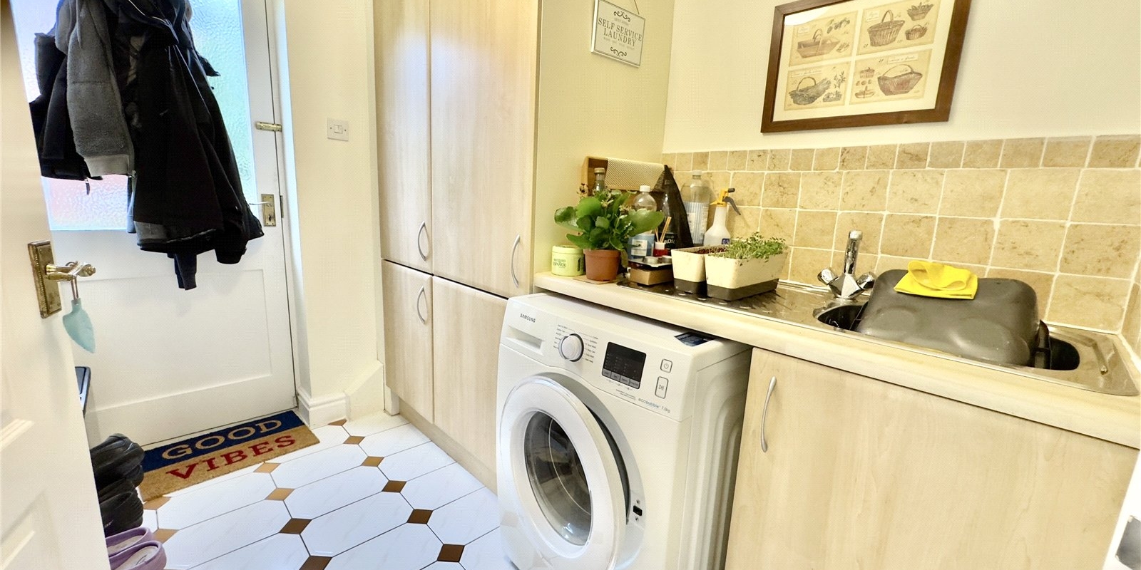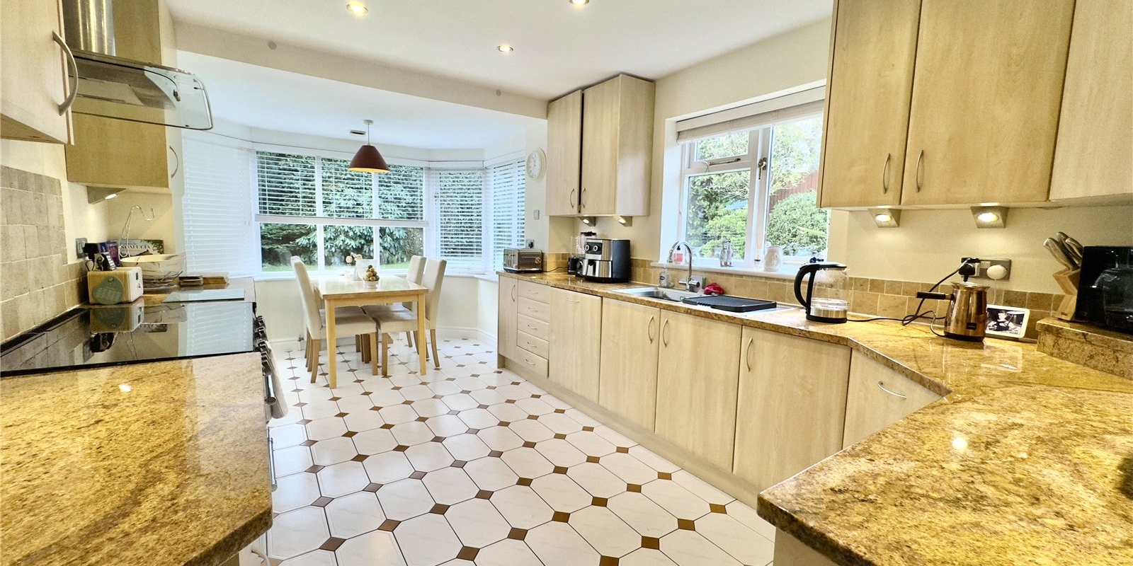 The ground floor comprises a welcoming porch leading into a bright dining hallway, with an additional sitting room off the hall and a convenient ground-floor WC. The spacious main sitting room features a newly fitted fireplace and flows into a conservatory, both of which enjoy lovely views over the rear garden. The large kitchen diner is fitted with a wide range of wall and base units, granite worktops, and a charming walk-in bay window, perfect for family dining. A practical utility room off the kitchen provides direct access to the rear decked entertaining area.