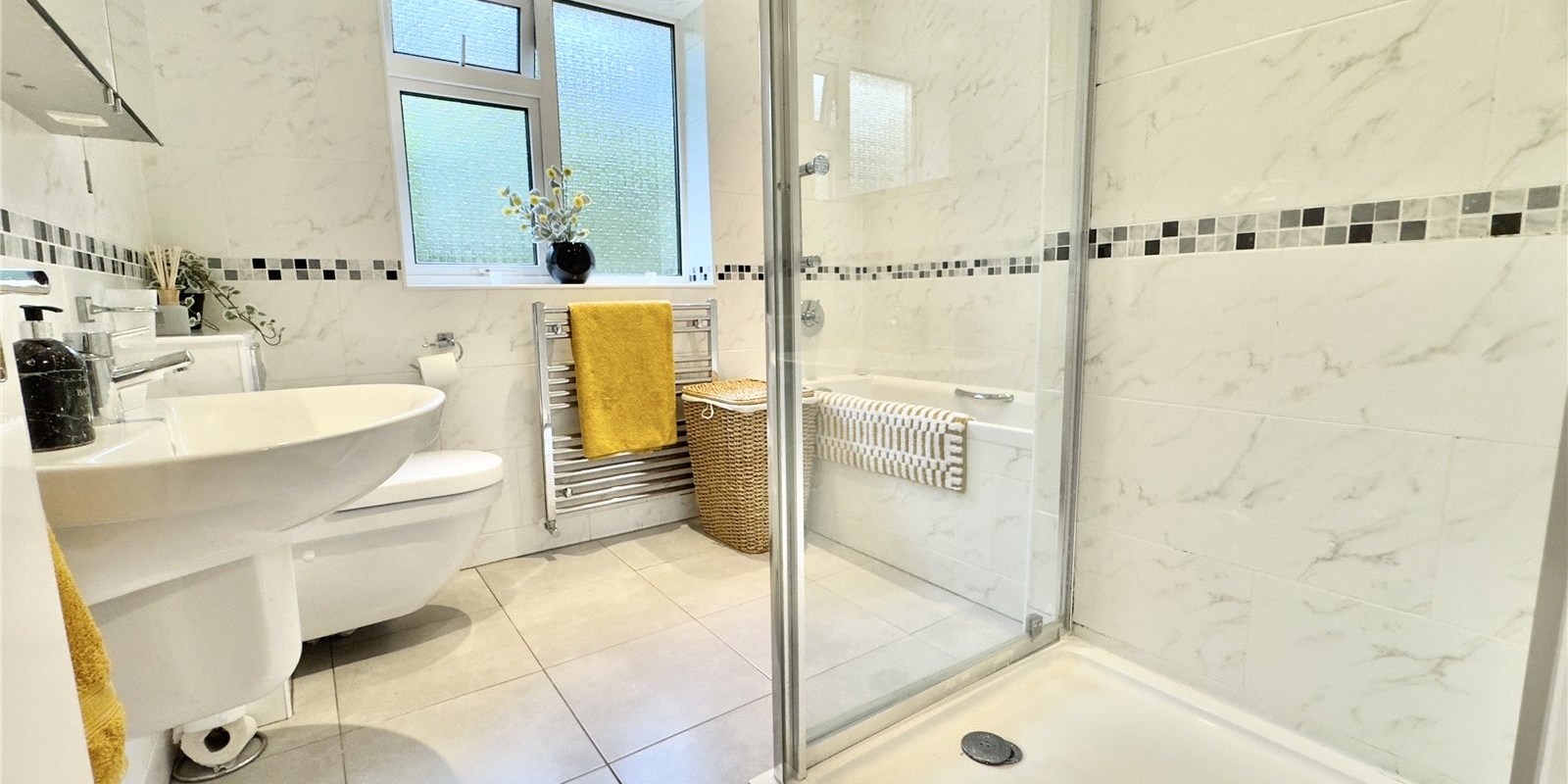 To the opposite side of the bungalow, a second hallway gives access to three generously sized double bedrooms, all of which feature built-in wardrobes. This area also includes two useful storage cupboards and a large four-piece family bathroom.