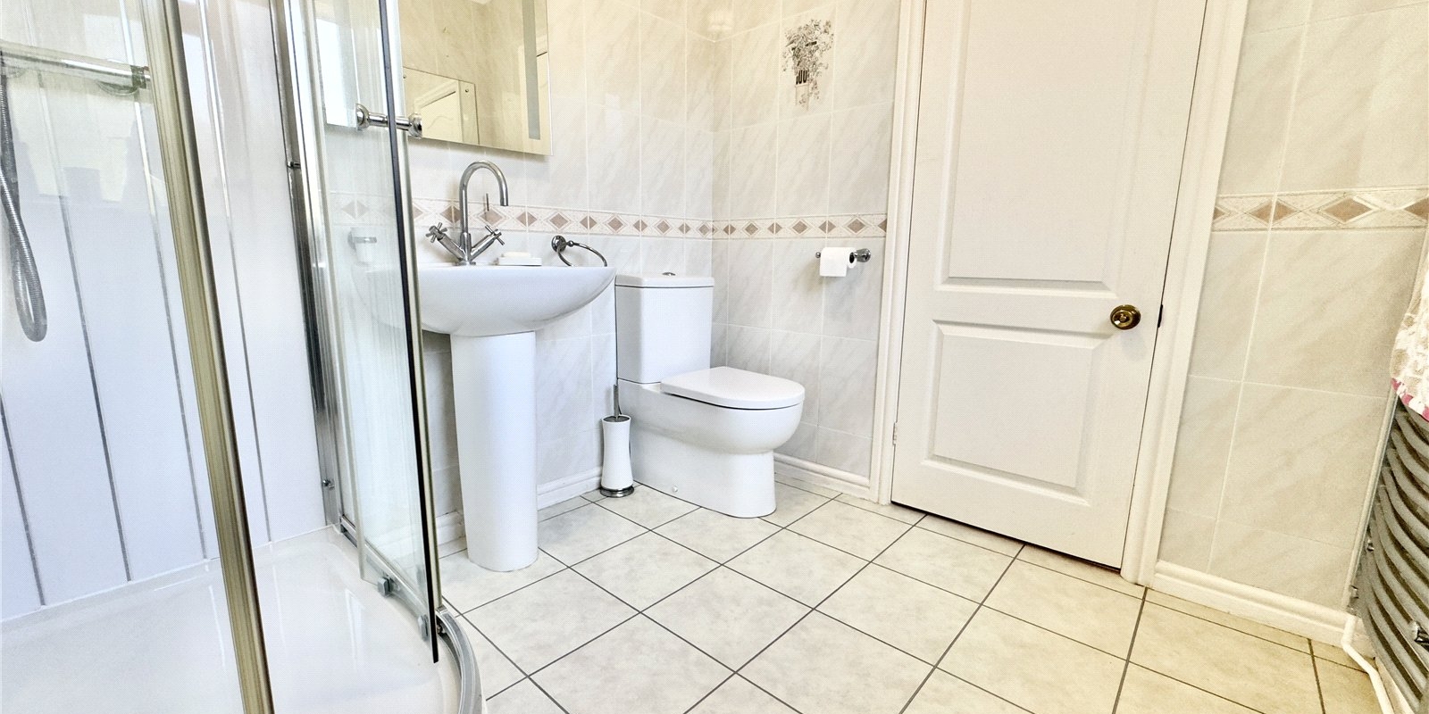 The accommodation is well laid out and begins with a welcoming hallway, from which three generously sized bedrooms are accessed. The principal bedroom features a stylish en-suite shower room, while the second bedroom enjoys direct access to the main bathroom, which is also accessible from the hallway, making it ideal for both family living and guests.