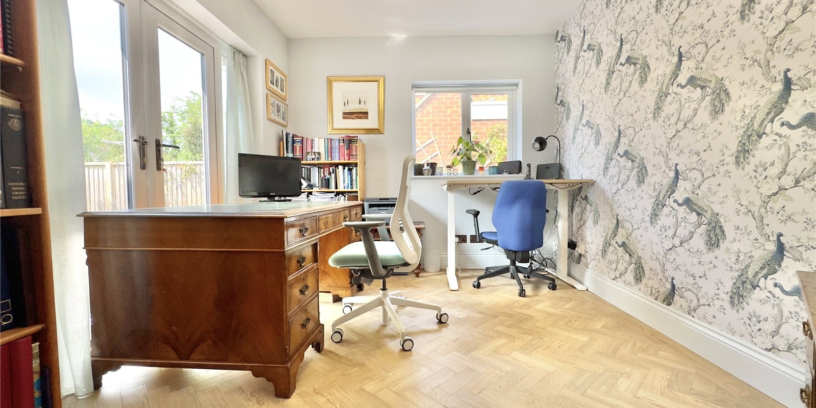 Upon entering, a generous entrance hall welcomes you and sets the tone for the rest of the property. Off the hallway is a dedicated office or study—perfect for remote working or quiet reading space. The heart of the home is the elegant lounge, which seamlessly connects to a large, bespoke fitted kitchen. This in turn opens into a stunning orangery, with both rooms featuring bi-folding doors that lead out to the beautifully landscaped rear garden, creating a wonderful indoor-outdoor living experience.