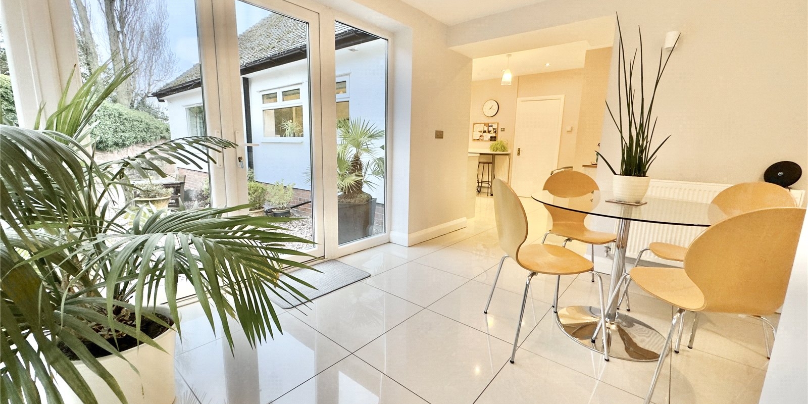 The kitchen flows seamlessly into a bright breakfast room, which benefits from floor-to-ceiling windows running the full length of the room and French doors opening onto a private patio area.