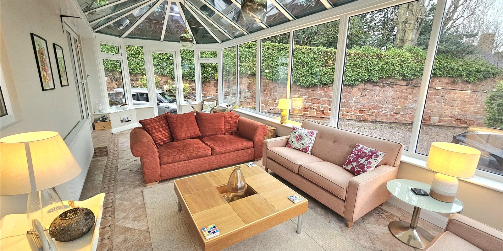 The property sits within beautifully maintained grounds, enclosed by established greenery, sandstone walls, and mature trees. A well-kept lawn wraps around the property, complemented by a flagged patio area ideal for outdoor seating. There is also ample off-road parking.