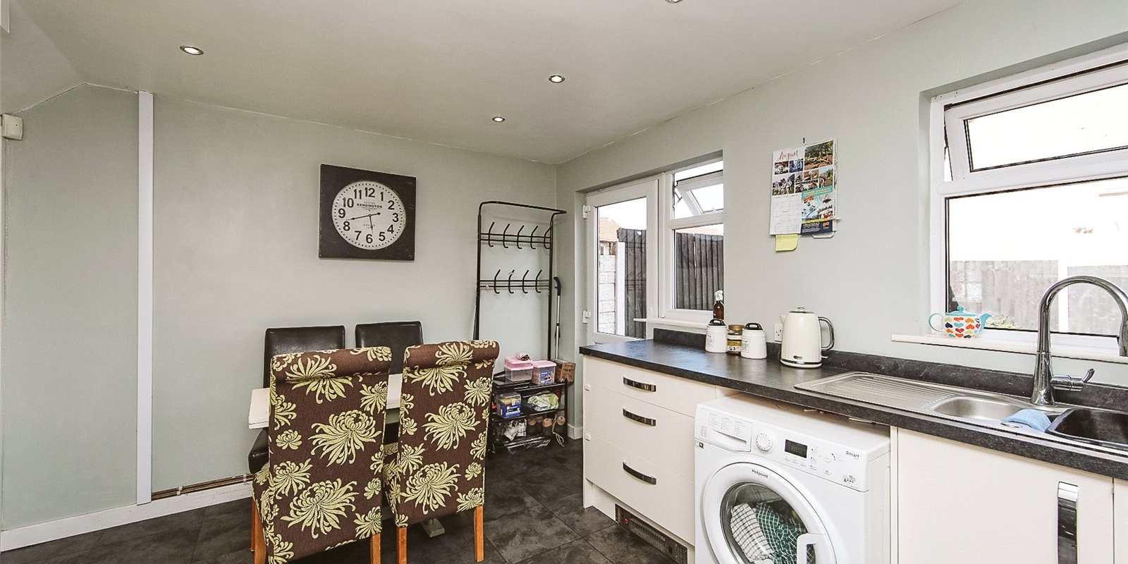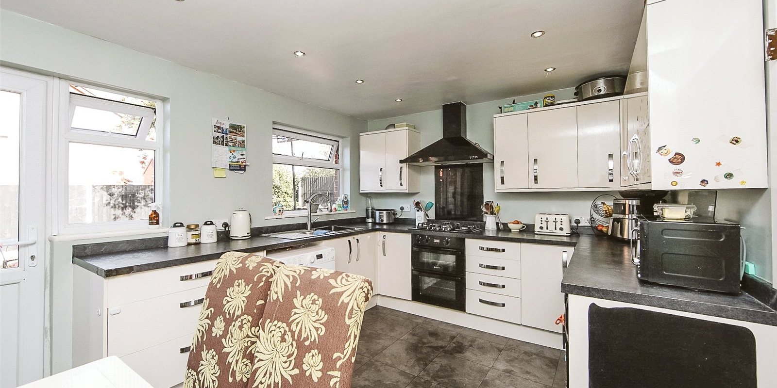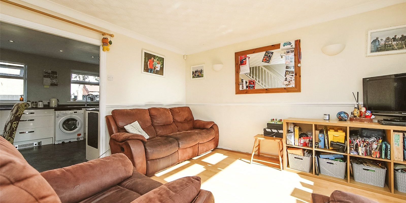 Step inside to find a bright and airy open-plan kitchen-diner with modern fitted units, integrated appliances, and direct access to the rear garden — perfect for summer BBQs or watching children play.