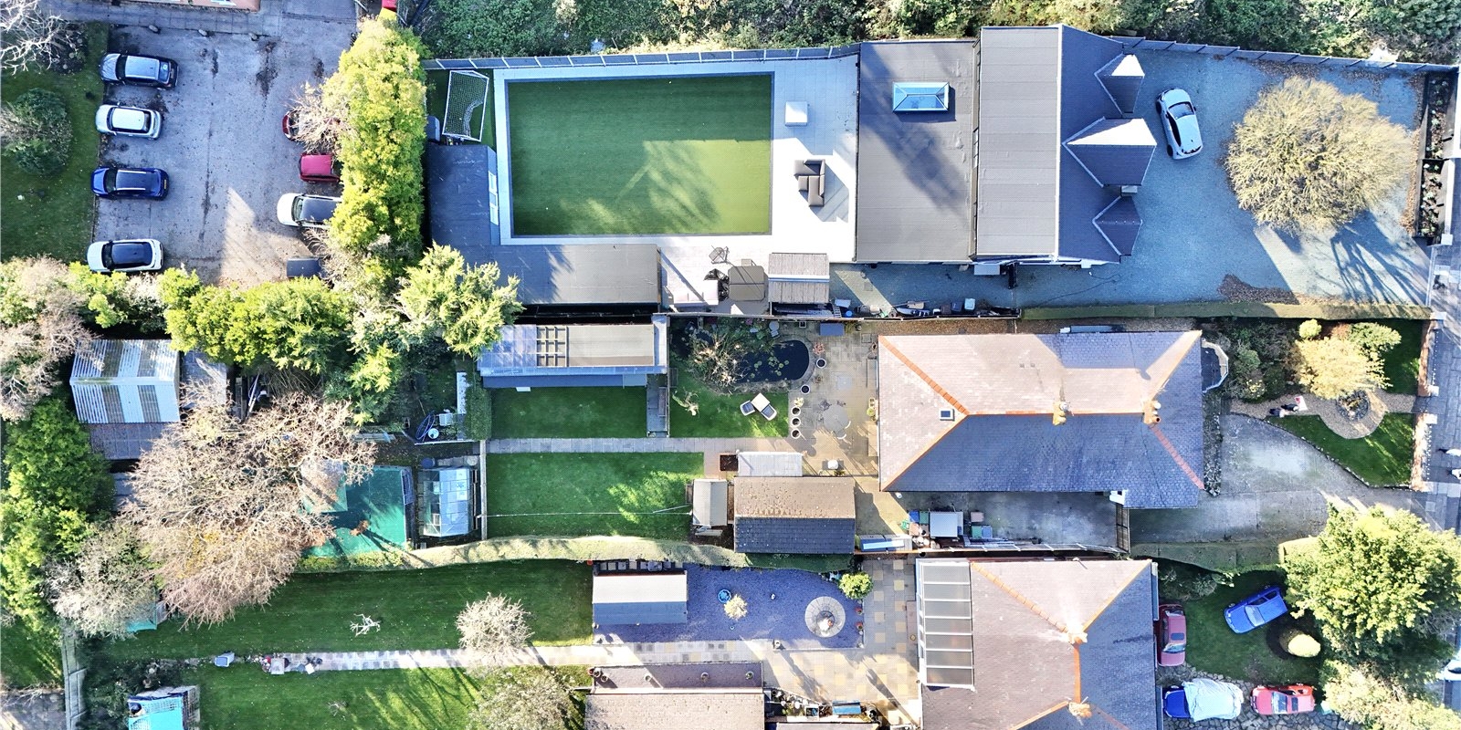 Set on a substantial plot, this characterful bungalow is approached via a long driveway providing off-road parking for numerous vehicles, leading to a detached garage. The generous frontage creates an immediate sense of privacy and space, while the vast rear garden is an outstanding feature of the home. The current owners have previously utilised the garden for ponies, hens and exotic birds, while the main garden area includes a patio, lawn, pond and pigeon coop – offering huge versatility for families, hobbyists or anyone seeking outdoor space on a rare scale.