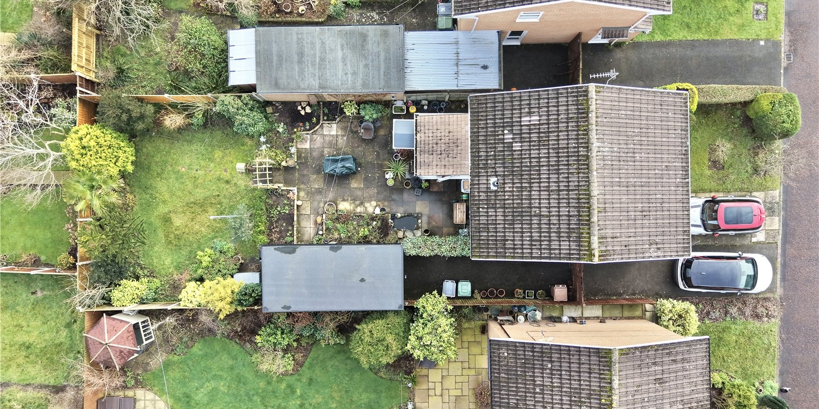 Front Garden - Driveway parking for several cars with double gates leading to further driveway and a detached garage.