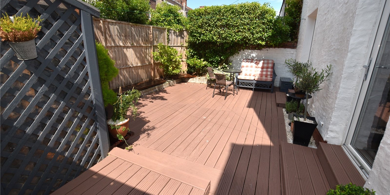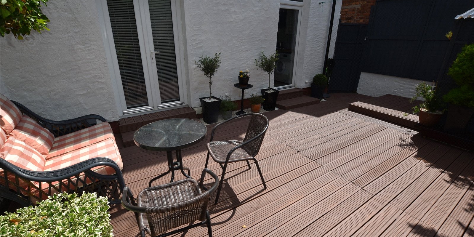 Outside, the rear courtyard beckons with its generous proportions and sun-soaked southwest aspect. Largely decked for low maintenance, it also features a handy shed for storage, completing this idyllic family retreat.