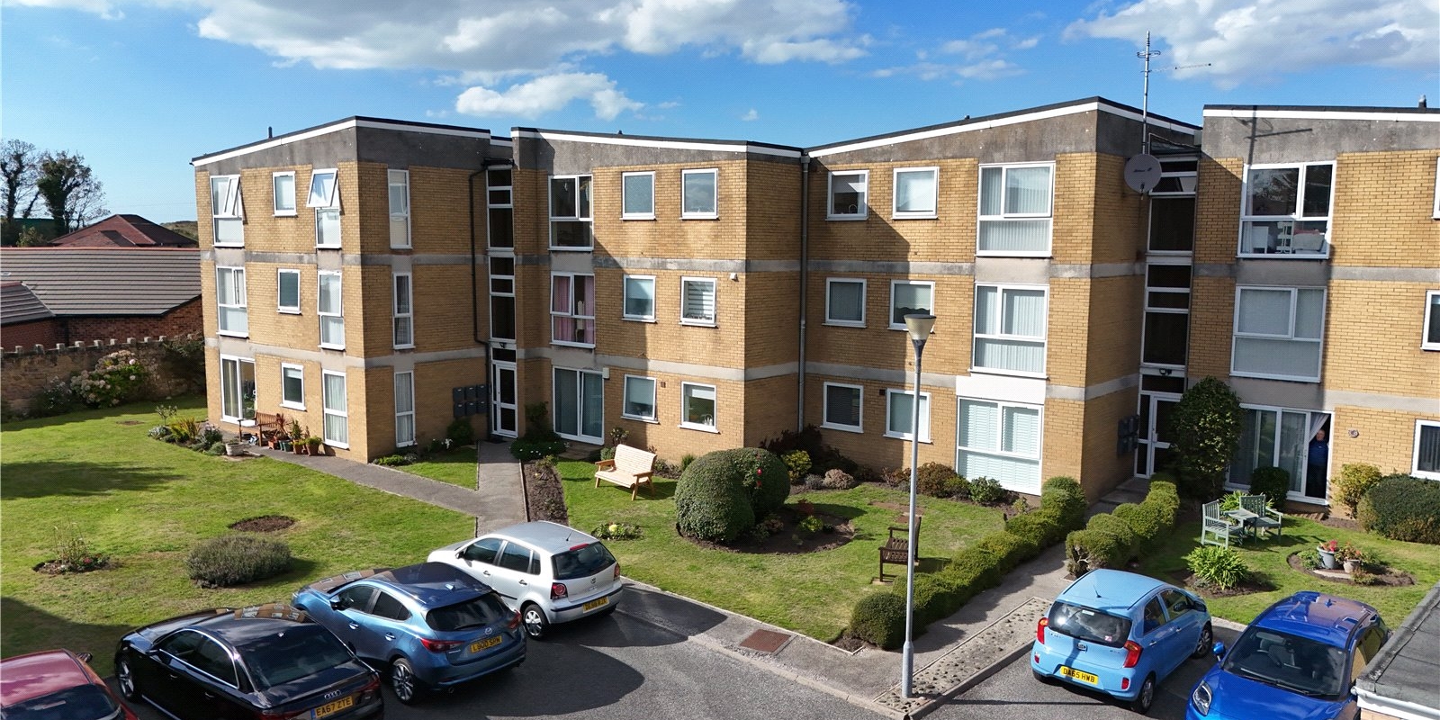 Externally, the apartment block is surrounded by carefully maintained communal gardens that provide a pleasant, green backdrop and contribute to the peaceful atmosphere of the development.