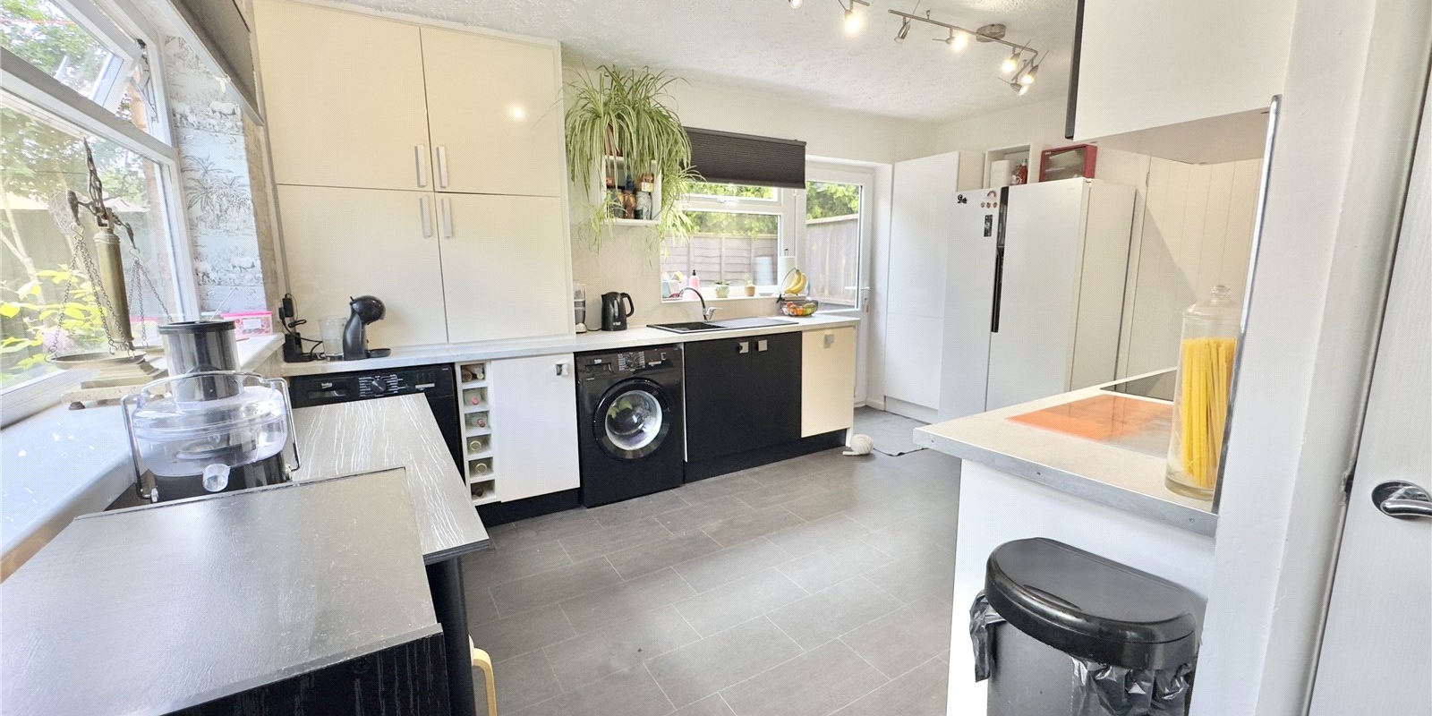 Step inside through a welcoming porch into the entrance hallway, which sets the tone for the rest of the home. Just off the hallway is a convenient downstairs WC, perfect for busy family life. The contemporary kitchen has been thoughtfully designed with sleek units, integrated appliances, and ample workspace—ideal for both cooking and entertaining. The kitchen flows seamlessly into the generously sized living room, which is both bright and airy thanks to a large front-facing window and patio doors that open into a spacious conservatory.