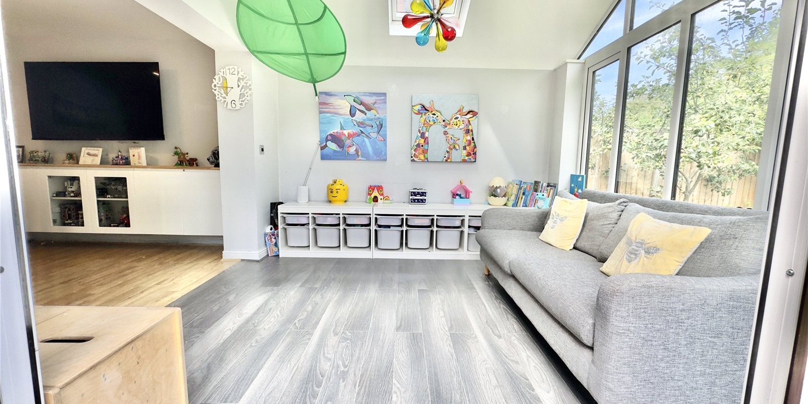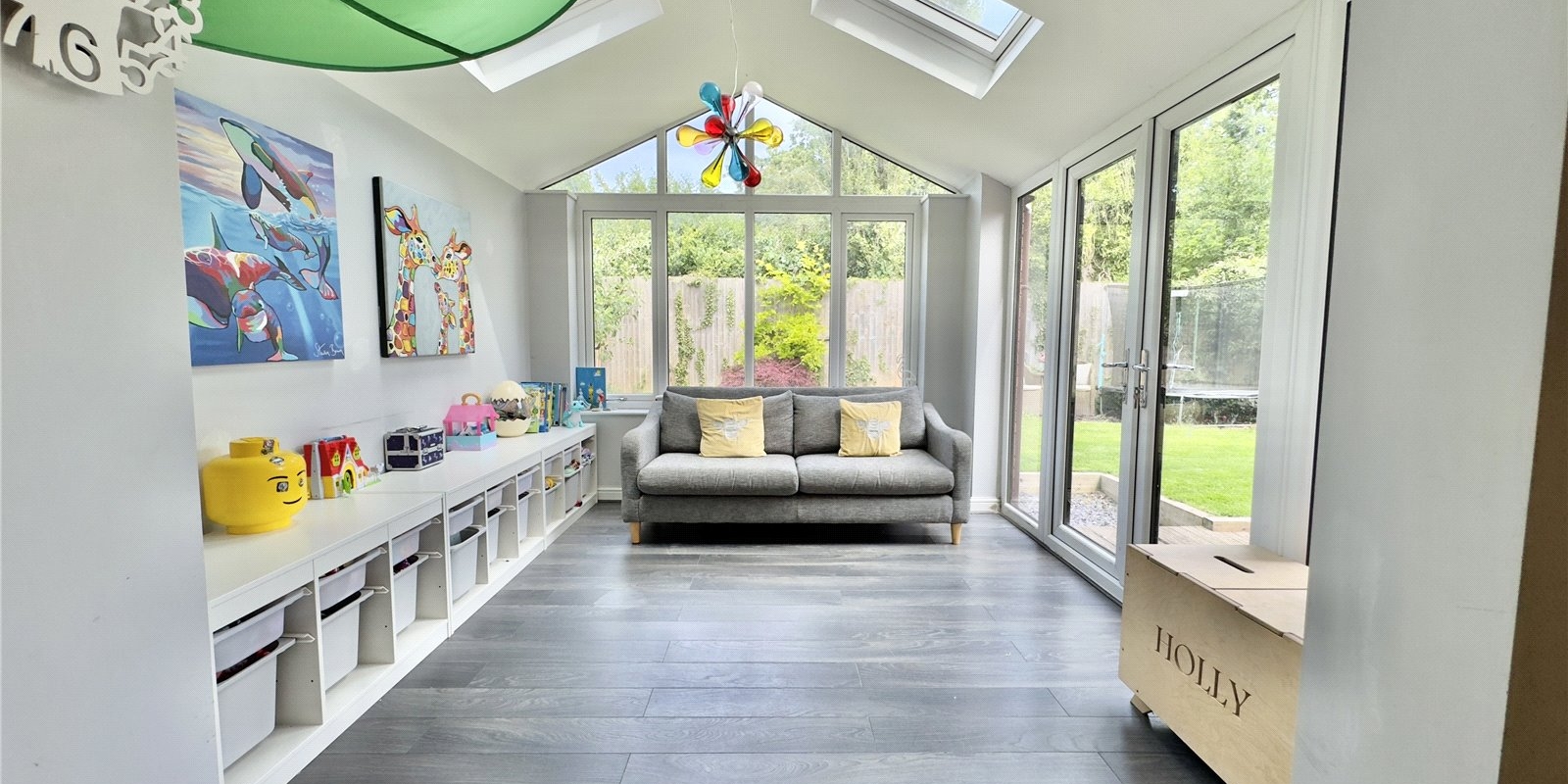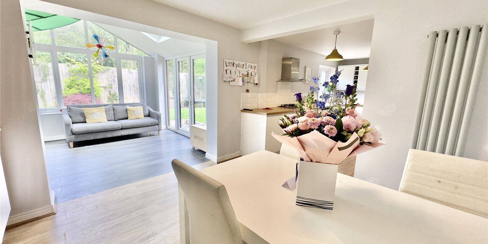 On entering the home, you're welcomed by a bright entrance hall with a handy storage cupboard and a downstairs WC. To the front, there’s a cosy lounge that provides a perfect space to relax. The stylish kitchen features crisp white cabinets, wooden worktops, and a white tiled splashback, flowing seamlessly into the open-plan dining and family area. This space continues into a stunning conservatory with a solid roof, skylights, and two glazed sides, creating a light-filled room that can be enjoyed all year round, with doors opening onto the rear garden.