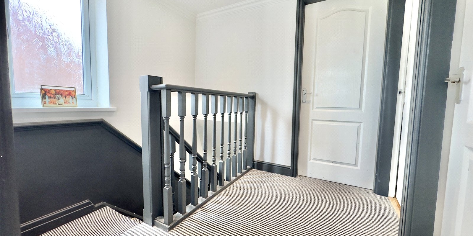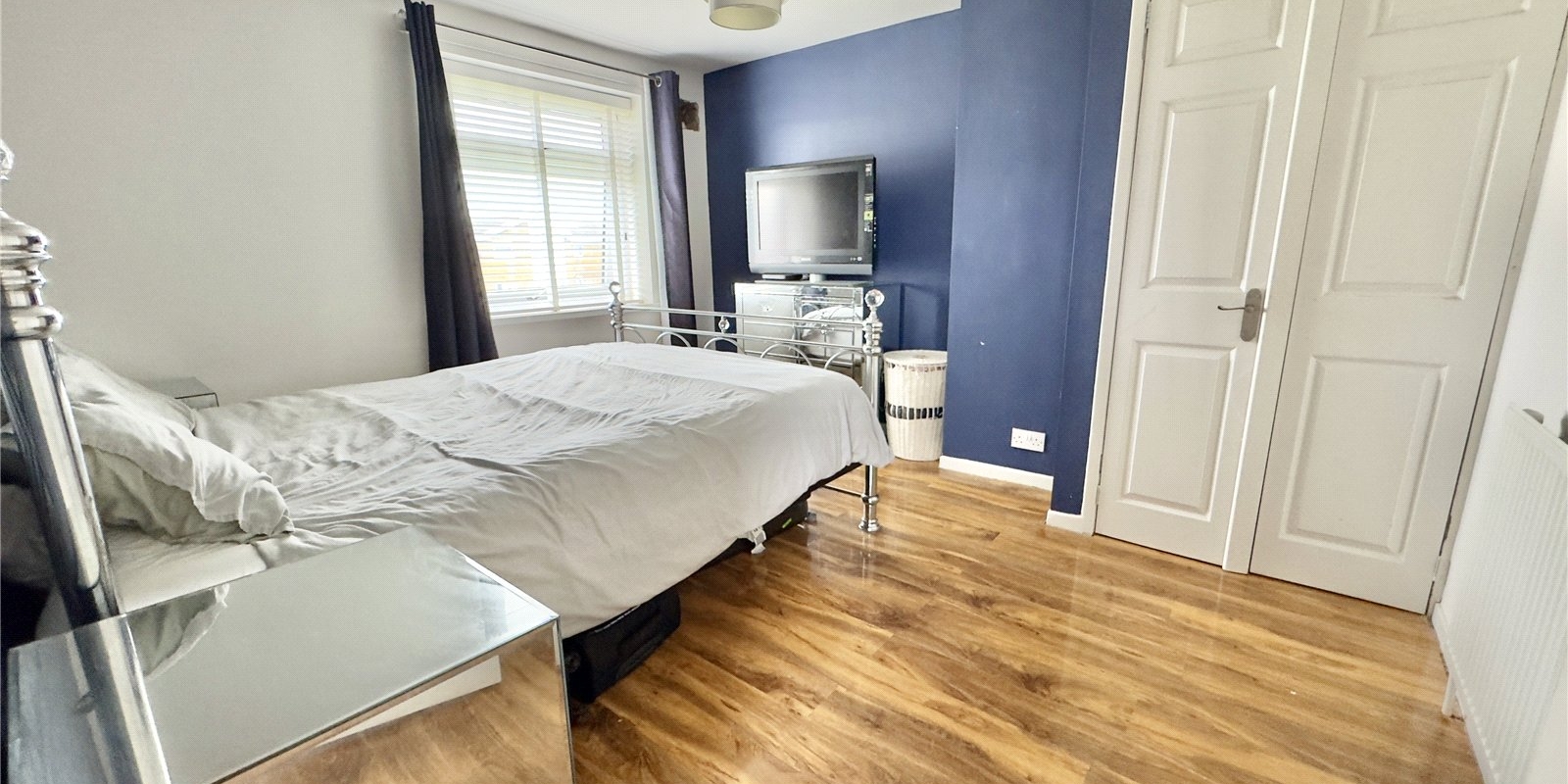Upstairs, there are three generously sized double bedrooms, two of which benefit from built-in wardrobes. The modern family bathroom is finished with a sleek three-piece suite, part-tiled white walls, mosaic flooring, and complementary painted surfaces, offering a stylish and functional space.