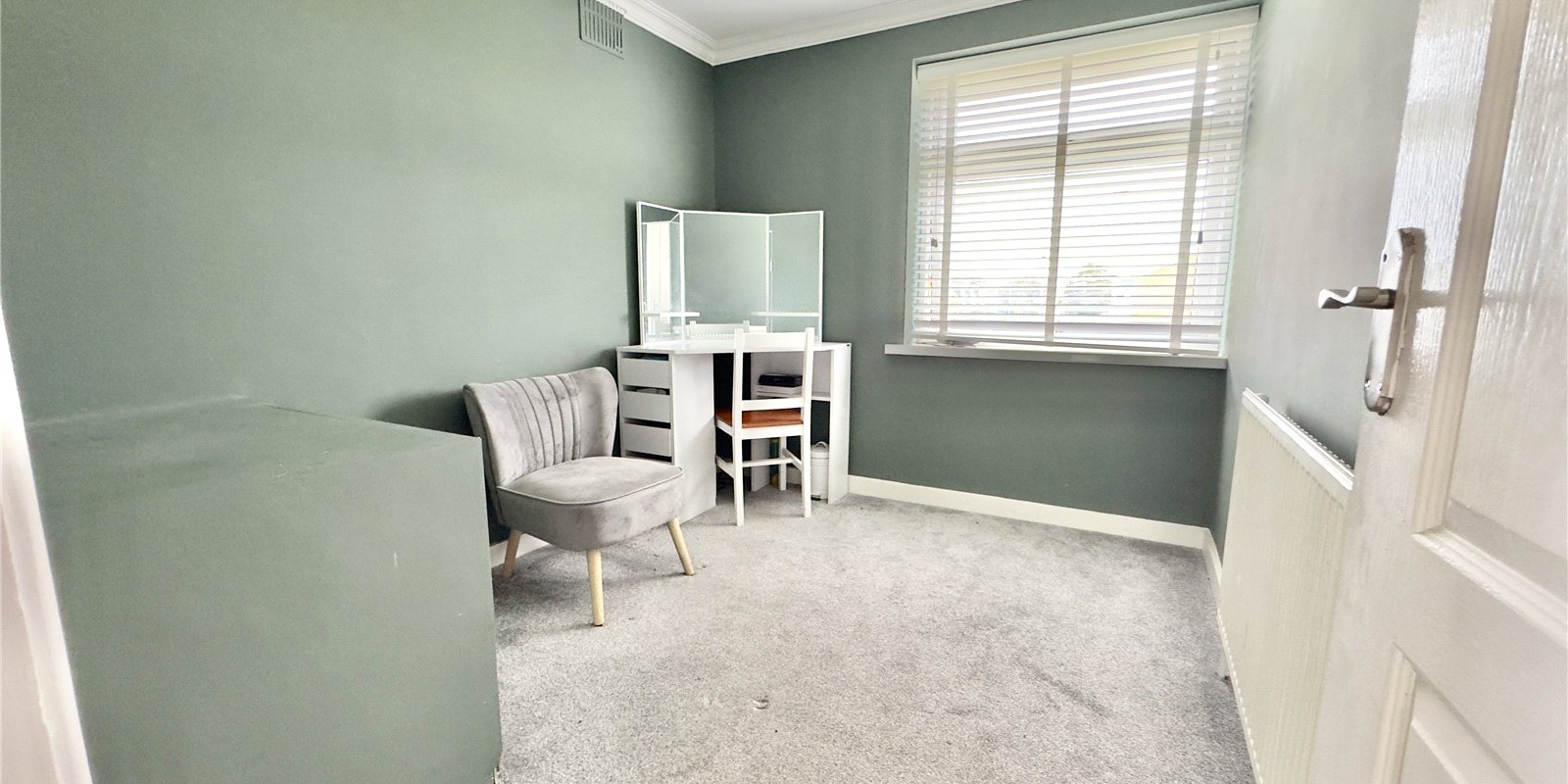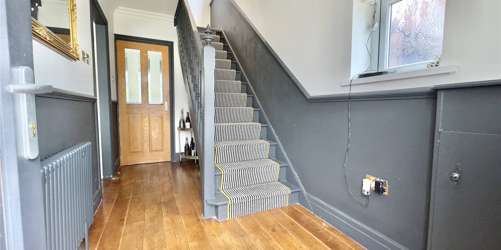 Upon entering, you are welcomed by a spacious entrance porch—ideal for coats, shoes, prams, or additional storage—which leads into a bright and inviting hallway featuring solid stained wood flooring and a traditional-style radiator.