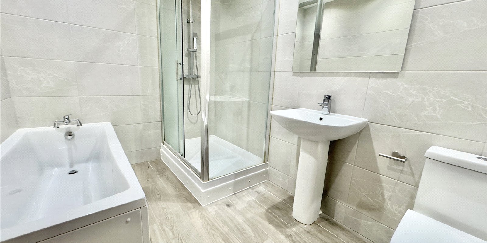 To the first floor there are four well-proportioned bedrooms along with a modern grey and white bathroom fitted with both a bath and a separate walk-in shower cubicle. The property benefits from laminate flooring throughout and wooden internal doors, adding to the overall sense of quality and thoughtful design.