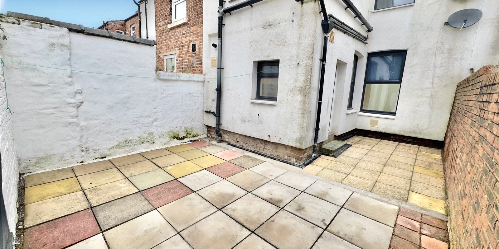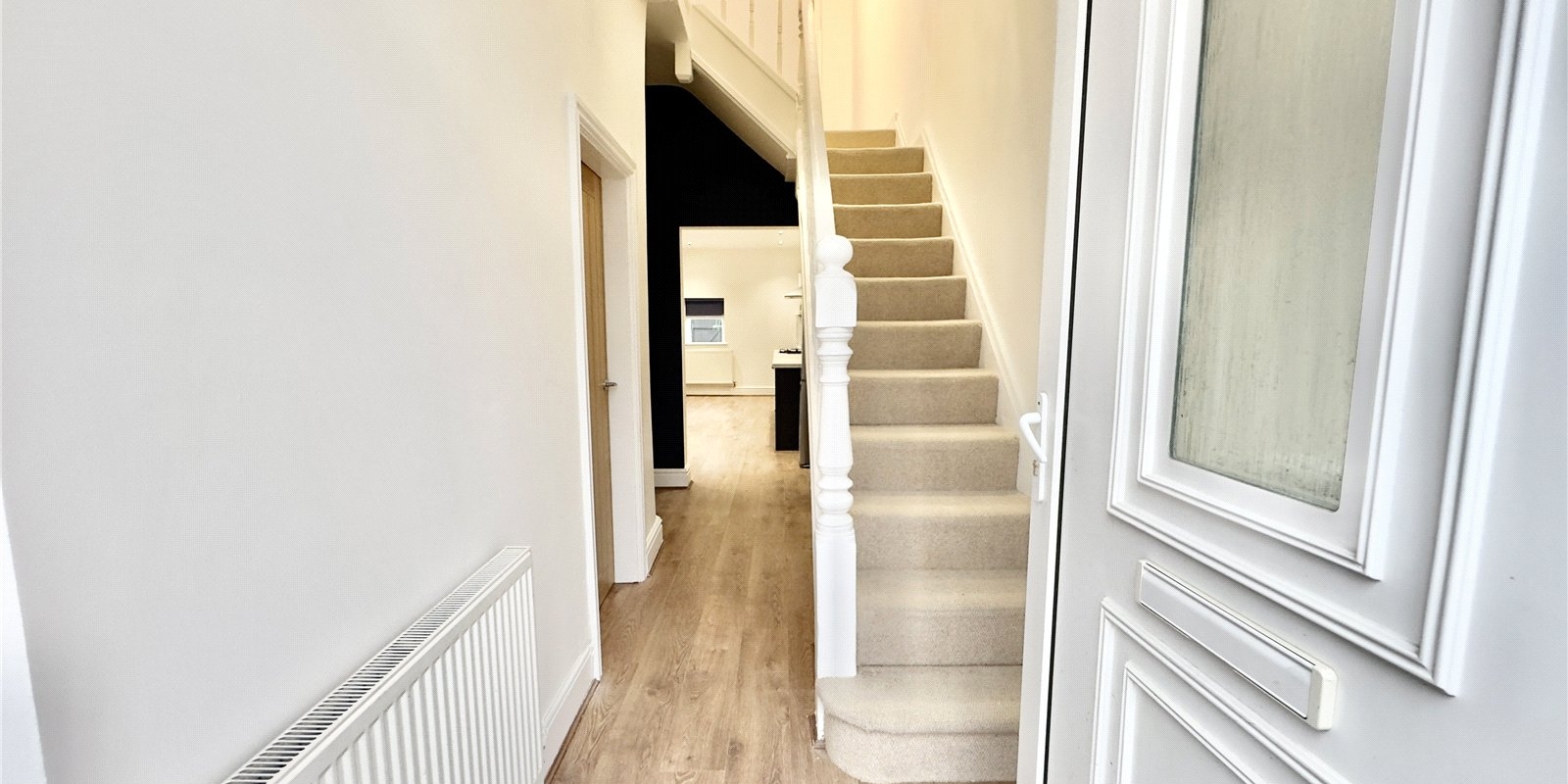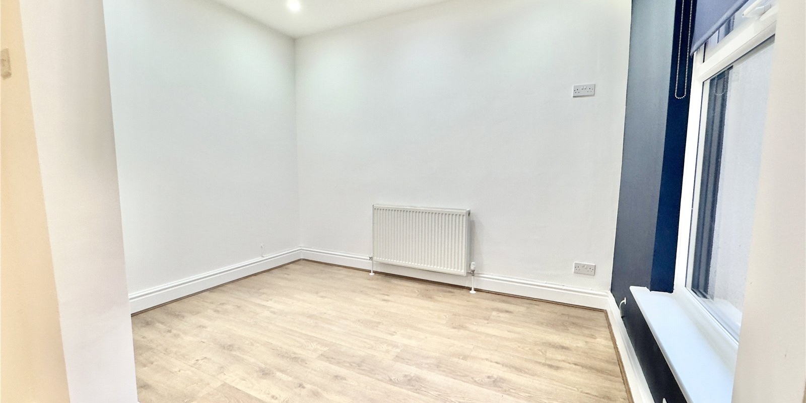 On entering the property you are welcomed into a bright hallway showcasing high ceilings and contemporary décor. The front lounge features a large bay window allowing natural light to flood the room, complemented by a striking navy feature wall. The hallway is open to a stylish fitted kitchen finished with navy cabinetry, contrasting white worktops and a grey splashback. This space opens seamlessly into the dining area, continuing the coordinated colour scheme with another navy feature wall. The open-plan layout is enhanced by multiple windows, creating a light and airy space perfect for both everyday living and entertaining. The rear courtyard is accessed directly from the kitchen.