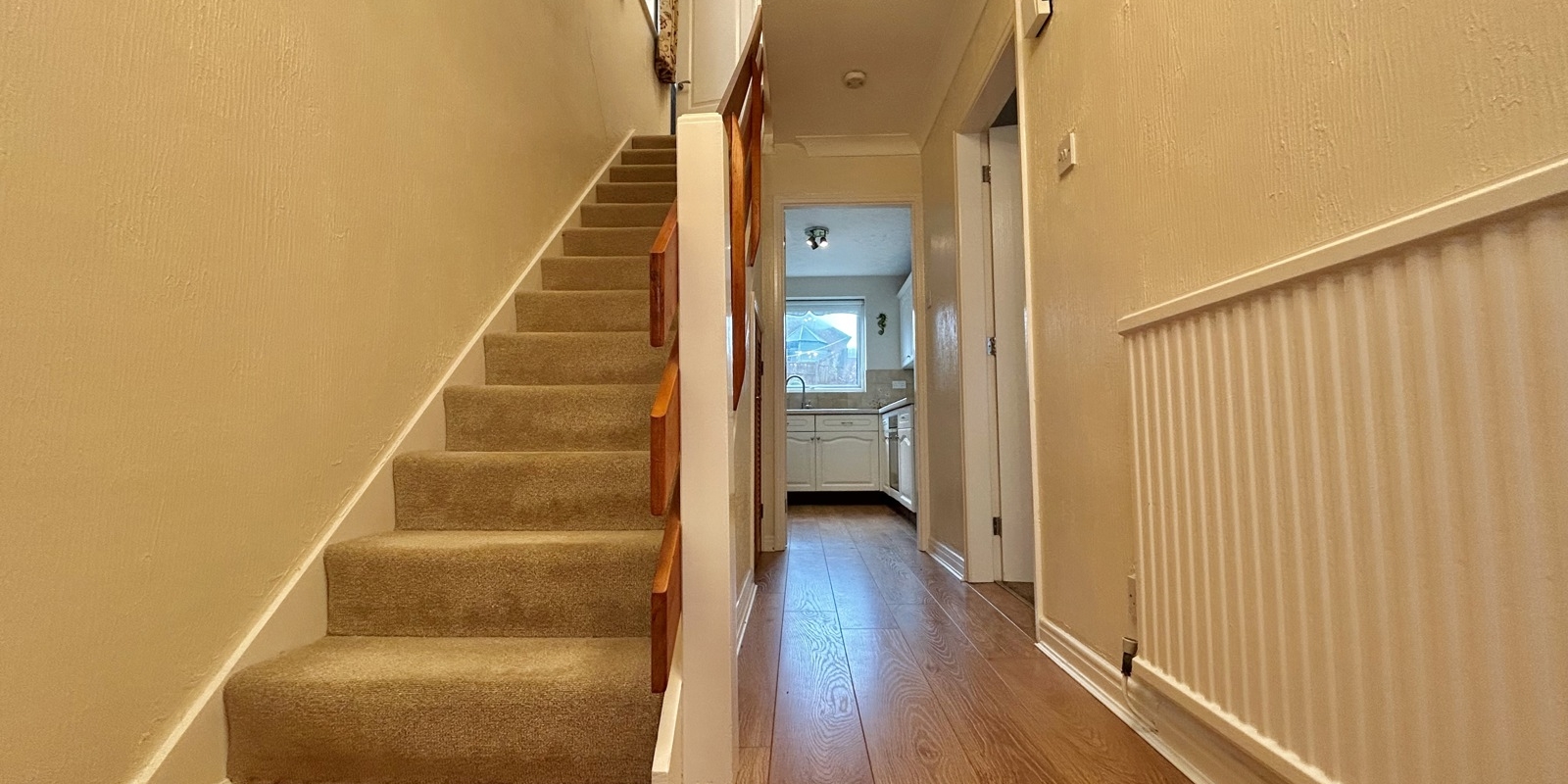 Upstairs are two generous double bedrooms, along with a well-proportioned third bedroom that is comfortably close to a double in size and benefits from built-in storage. A family bathroom and separate WC complete the accommodation.