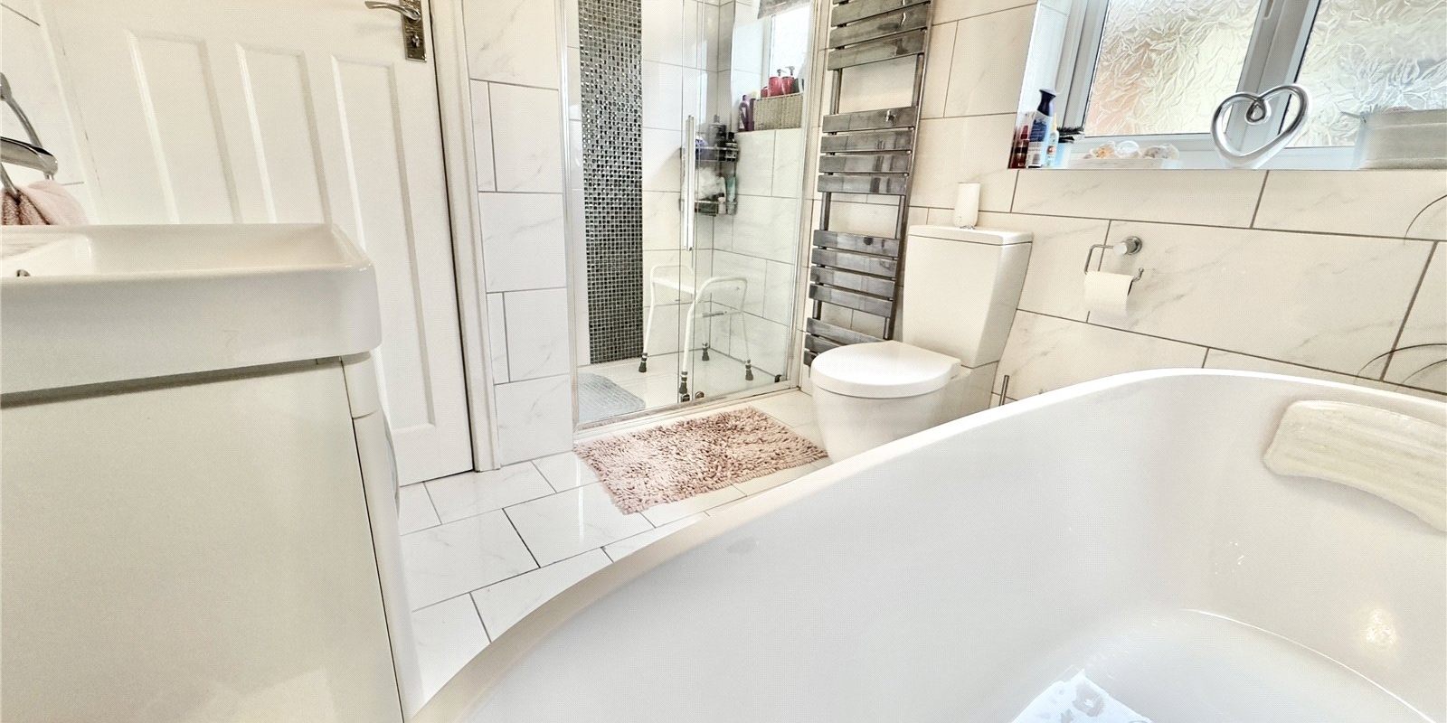 Upstairs, three generous bedrooms are filled with natural light and feature tasteful wooden blinds to the front elevation and perfect fit blinds at the rear.