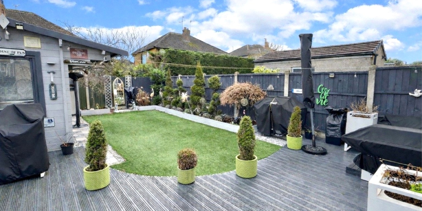 The decking offers multiple areas for seating and relaxation, while artificial turf ensures a low-maintenance yet visually appealing space.