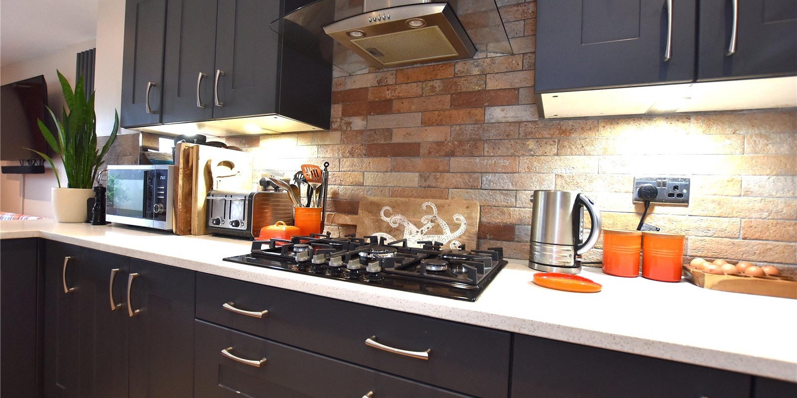 At the heart of the home is a stunning open-plan living kitchen, truly a family’s dream space. The contemporary design is complemented by a characteristic twist, featuring a classic Belfast sink, elegant quartz worktops, striking navy cabinetry and stylish herringbone flooring. Loft-style brick splashbacks run throughout the worktop areas, adding texture and an industrial edge that beautifully balances the classic features. With direct access out to the garden, the space offers seamless indoor–outdoor flow, perfect for entertaining and everyday family living.