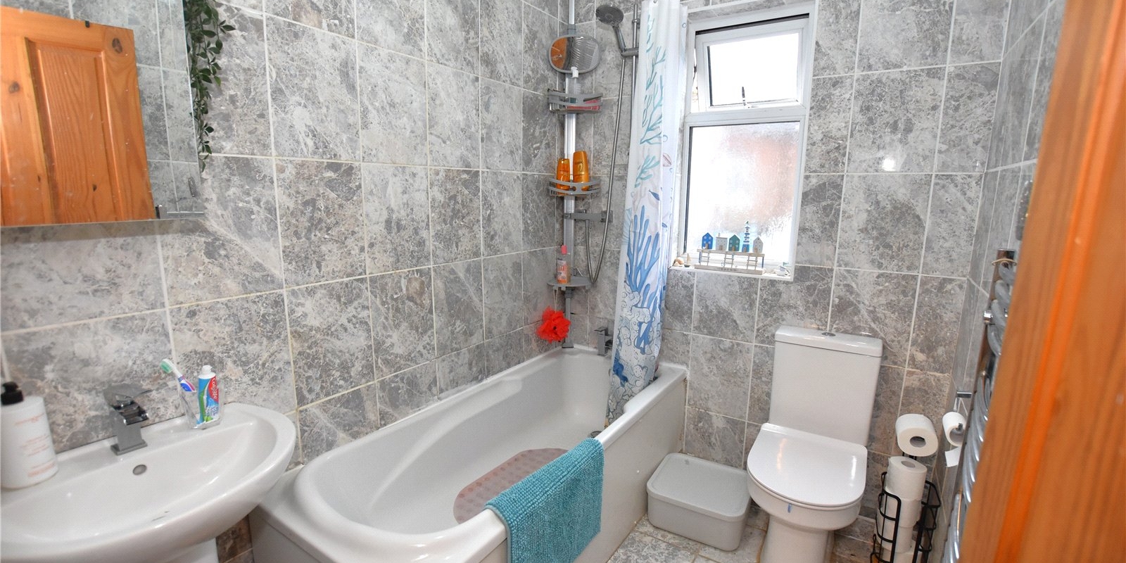 The bathroom is fully tiled and fitted with a modern suite to cater for family needs.